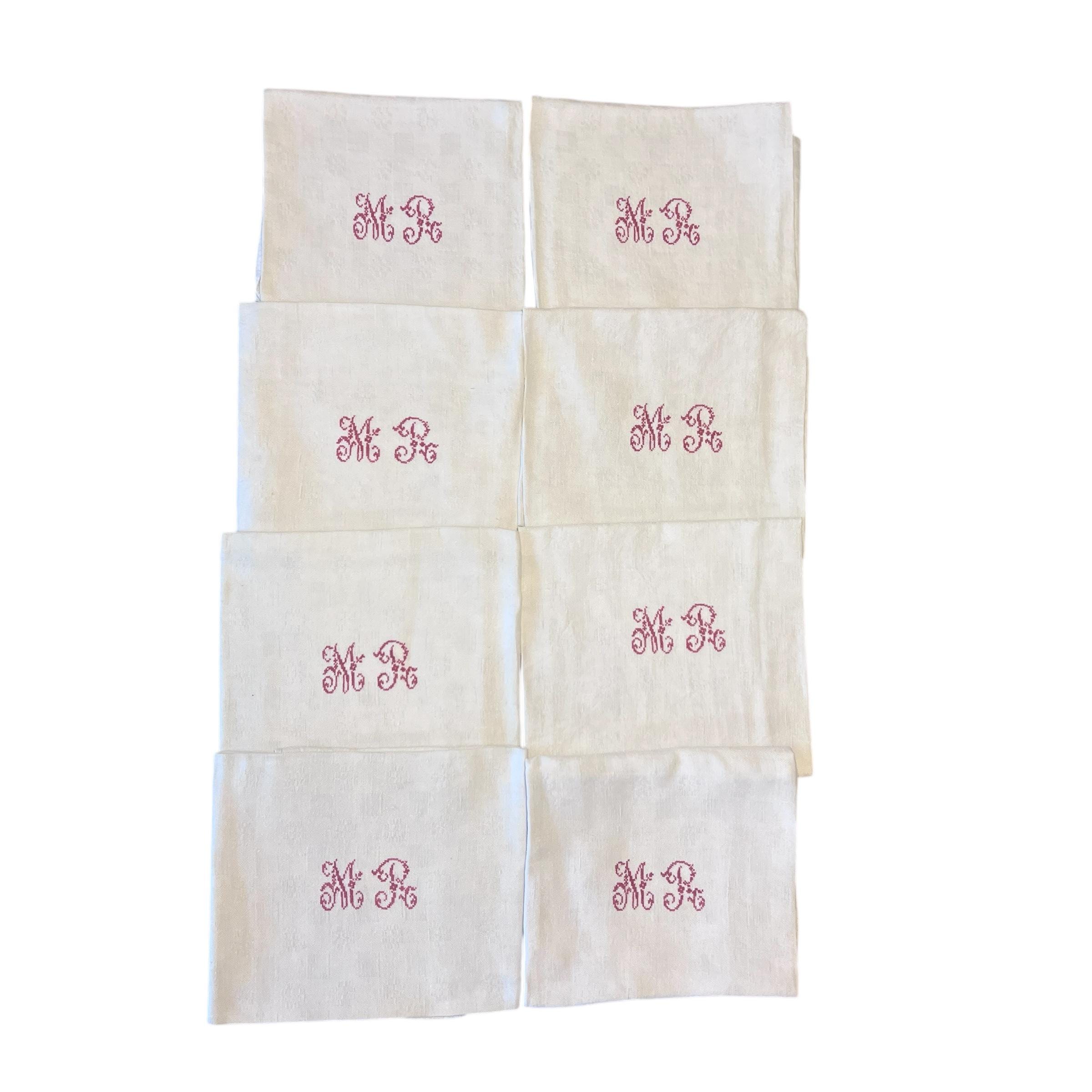 "Antique Large French White Linen Serviette/Napkin with Red Monogram \"M R\" - Torcho...
