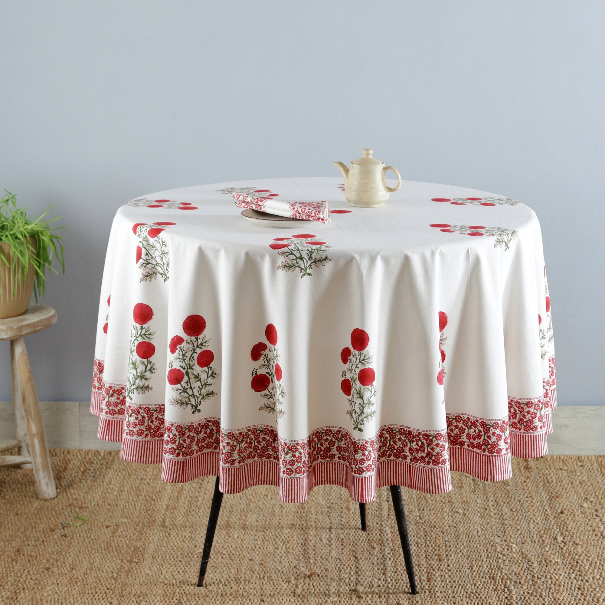 Indian Red Poppy Flower Block Print Round Table Cloth, Hand Block P...