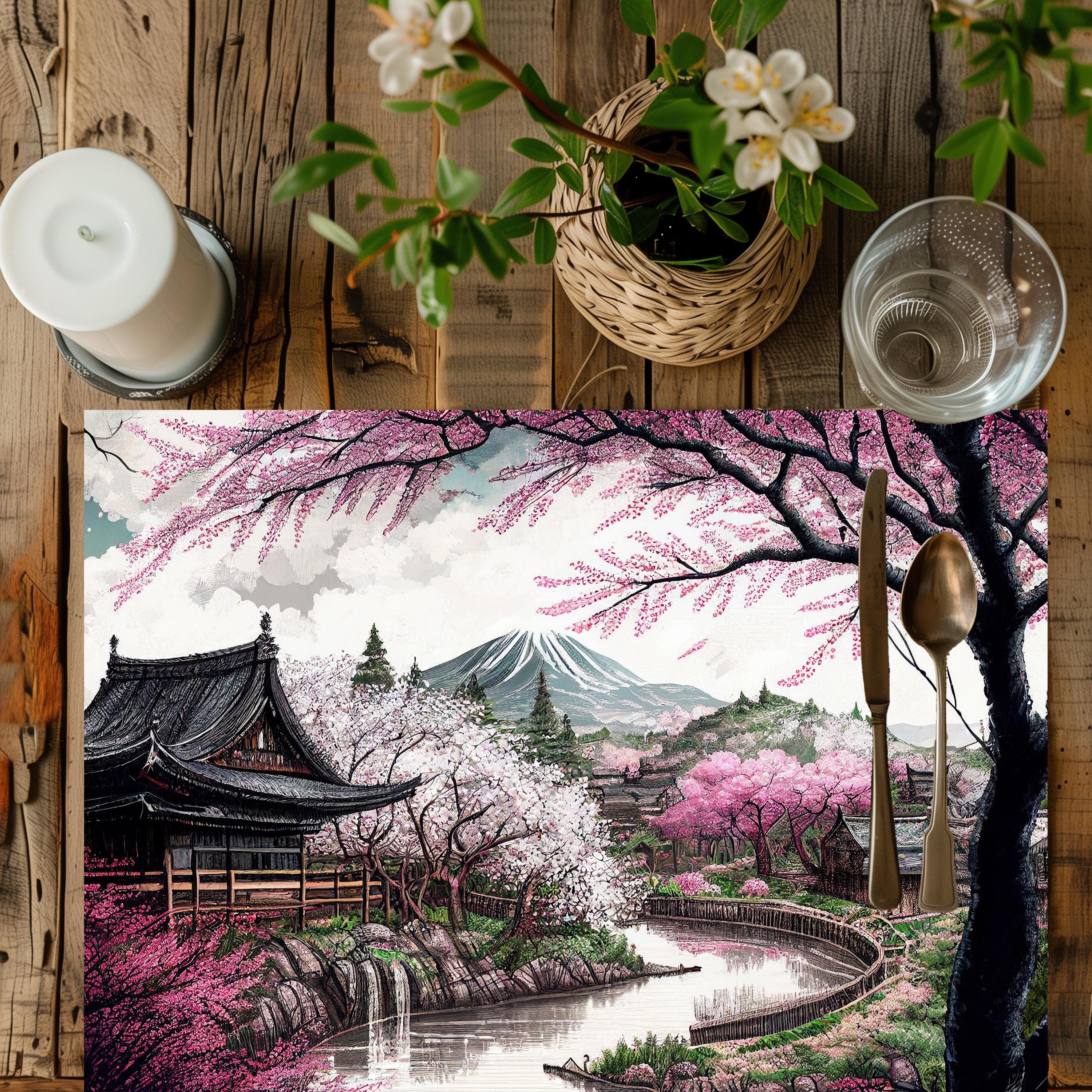 Japanese Sakura Village Placemat - Japanese Art Placemat - Japan Pl...