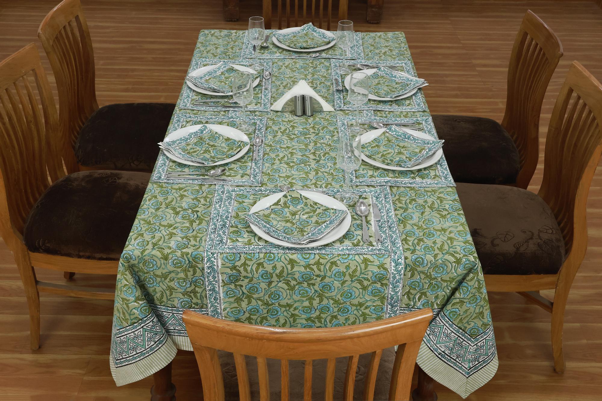 Green & Blue Indian Table Cloth, Hand Block Printed Table Cloth...