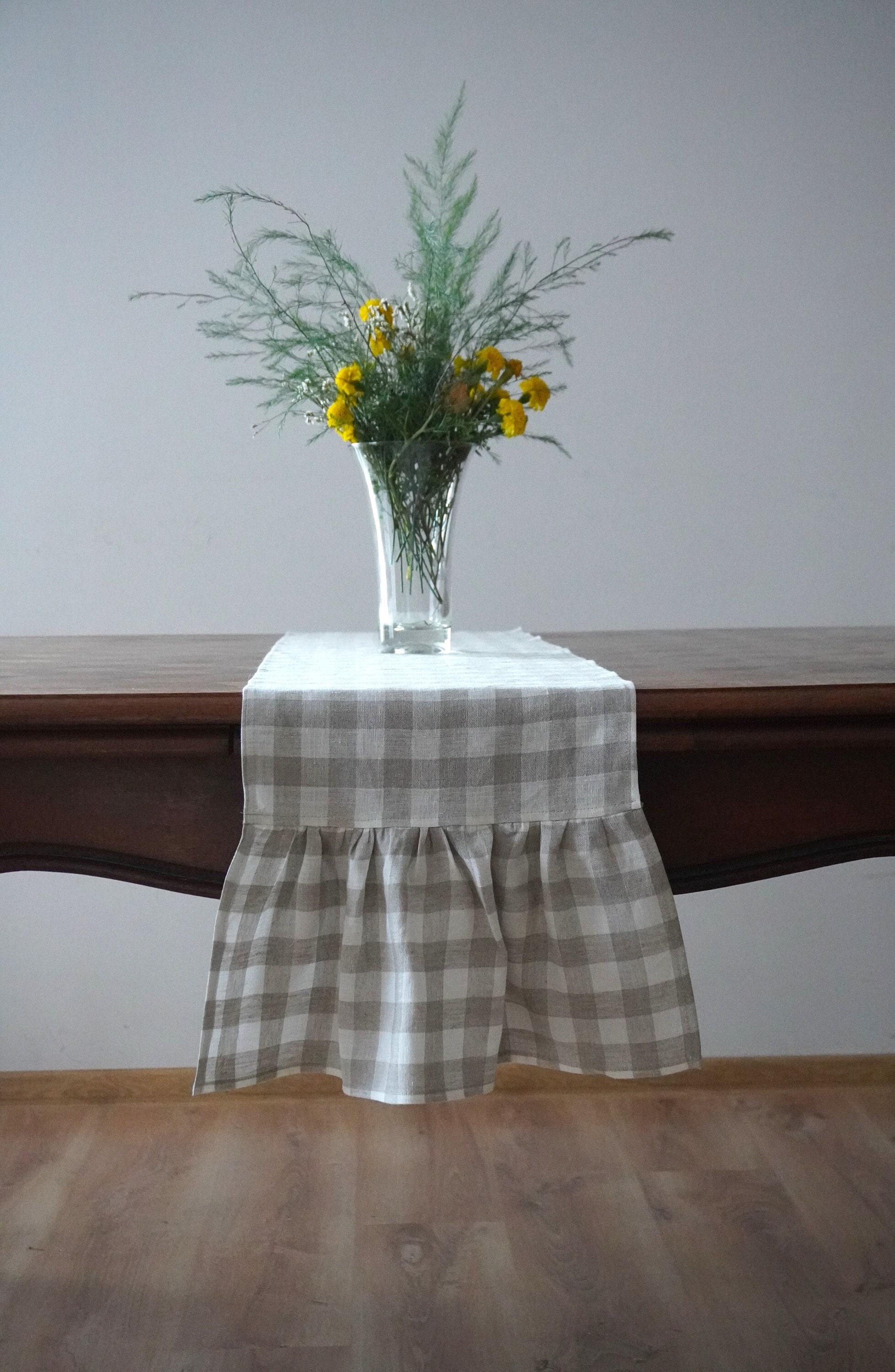 Gingham linen table runner. Ruffled table runner. Check table runne...