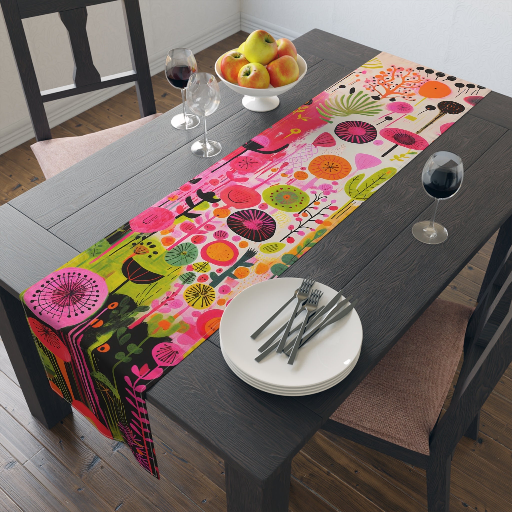 "Unique, colorful table runner with a festive vivid flower design, elegant dinner spring Kitche...