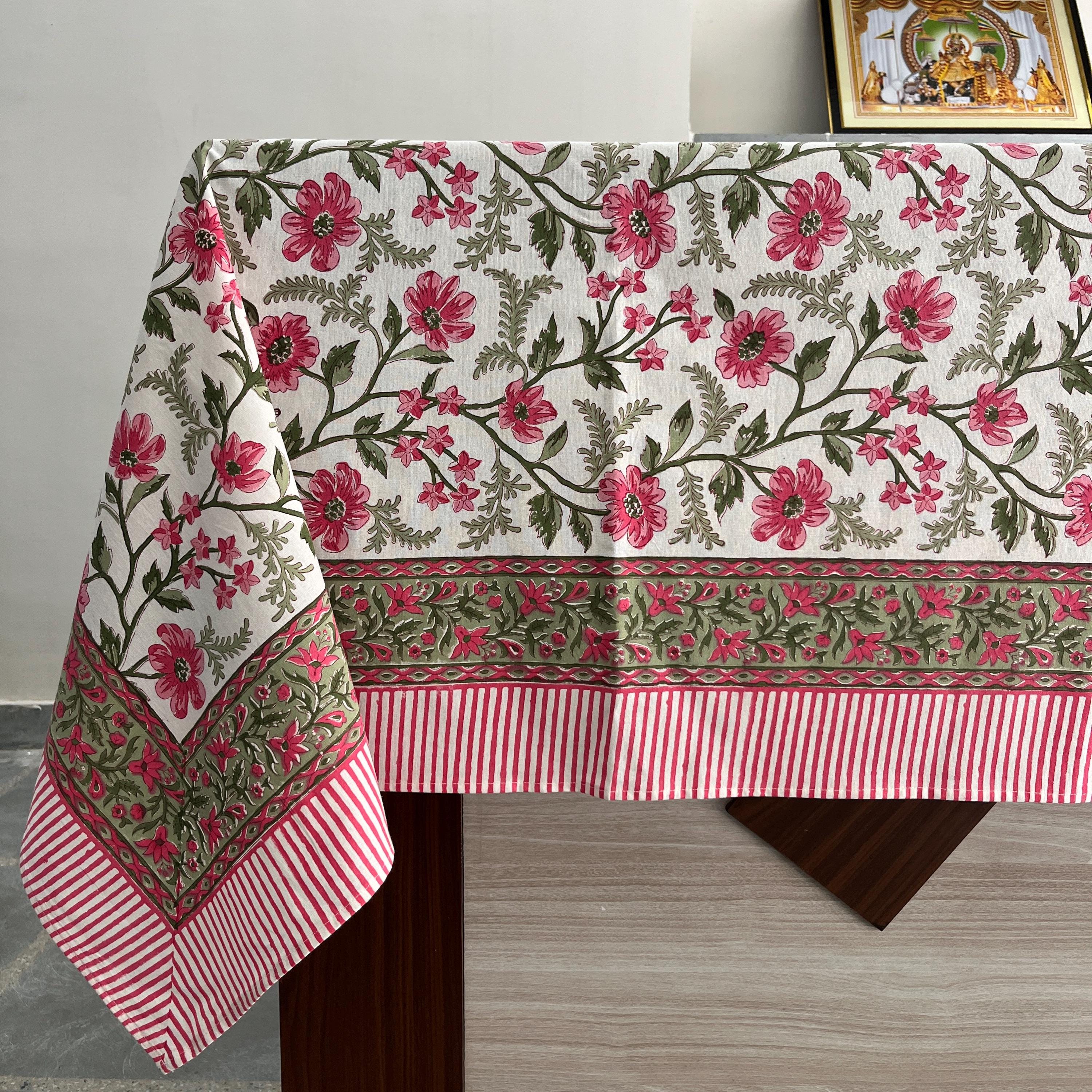 Tablecloth, Lotus Pink, Green Floral Indian Hand Block Printed clot...