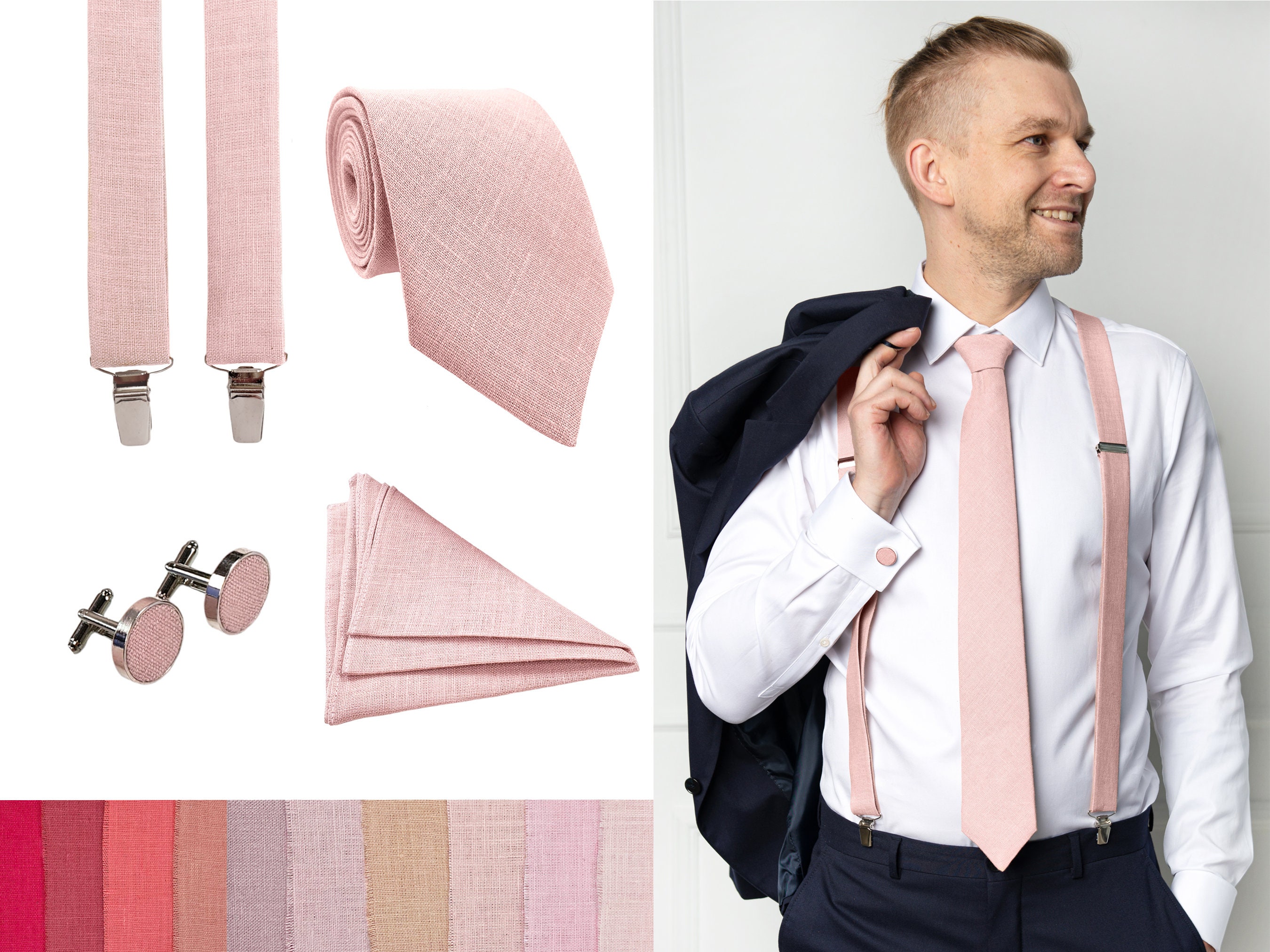 Blush Pink Regular Tie, Blush Pink Suspenders, Blush Pink Cufflinks...