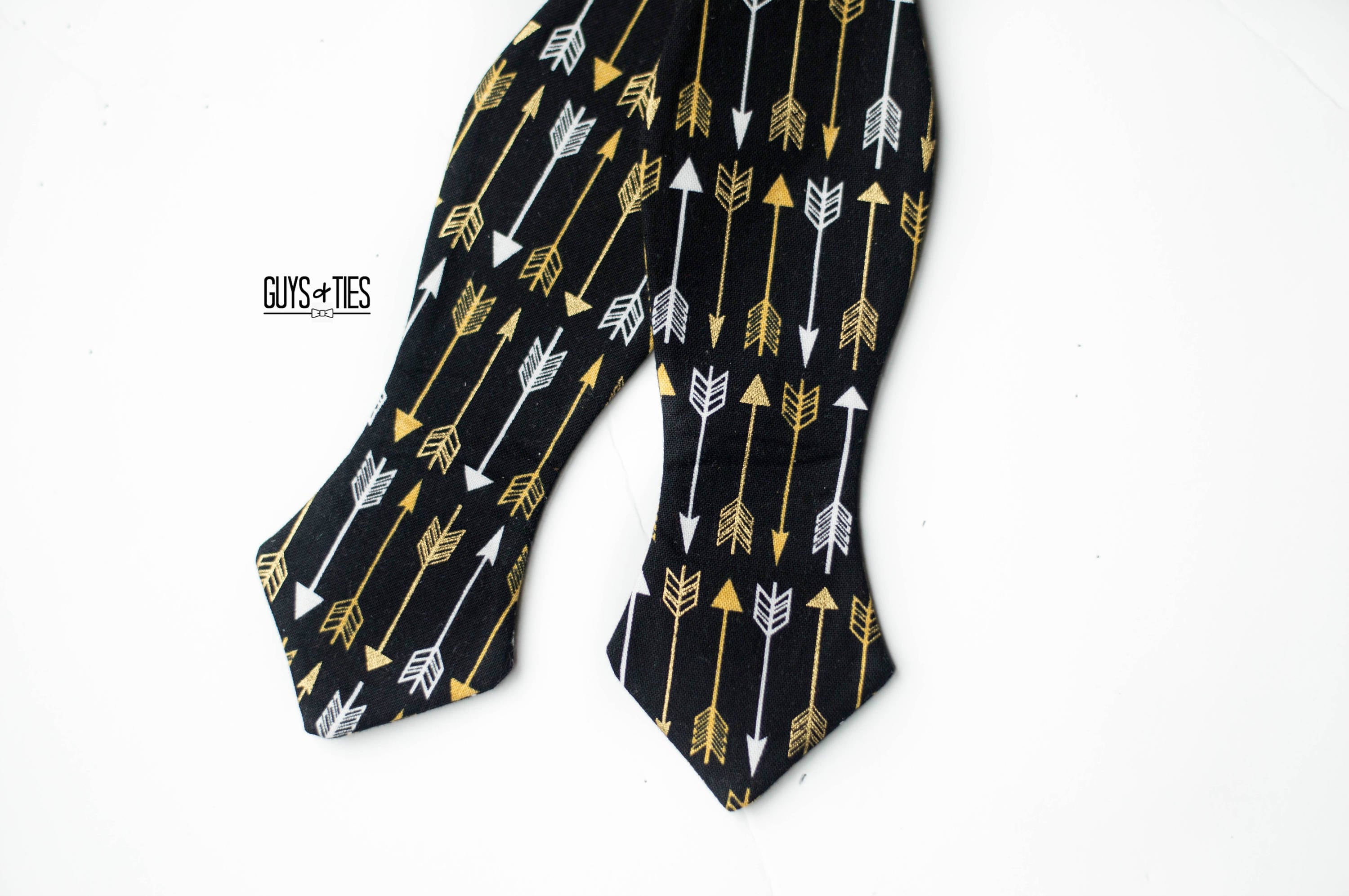 "A unique and one of a kind self tie bow tie! In a black, gold and white arrow design, this sel...