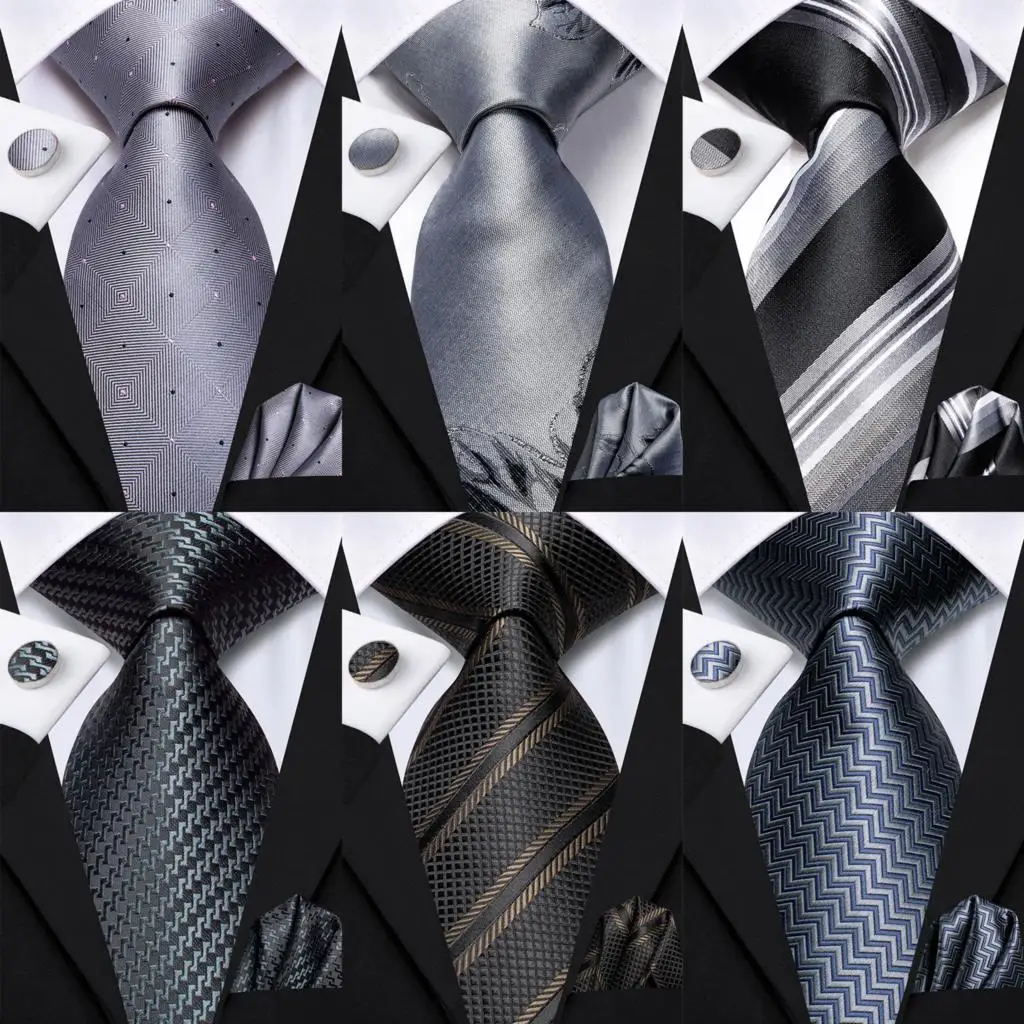 Hi-Tie Smoke Grey Tie For Men Elegant Mens Necktie Pocket Square Cufflink Groom Wedding Accessory Wh...