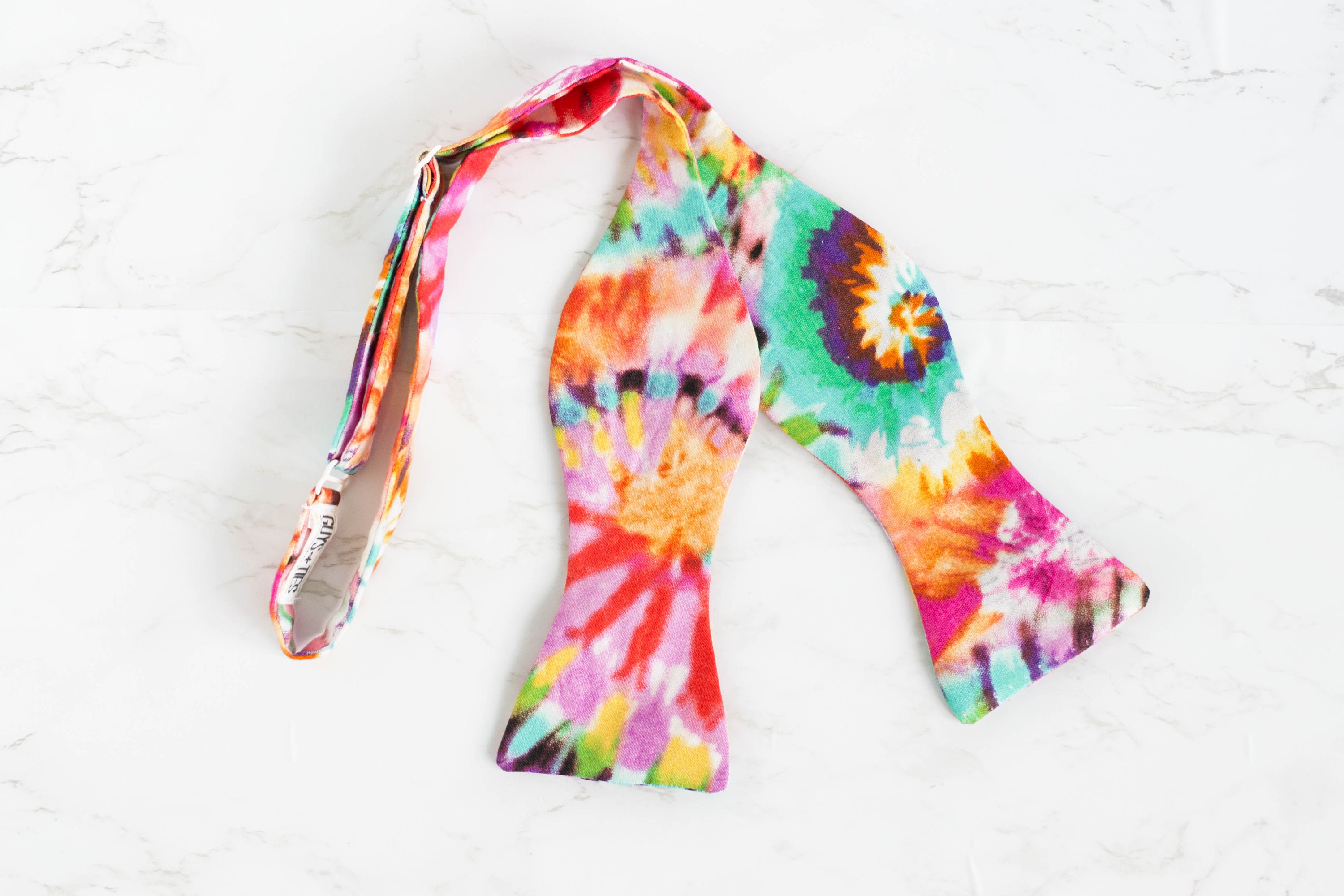 "A vibrant and colorful tie dye bow tie. The listing pictures show the 'adult selftie bowtie' s...