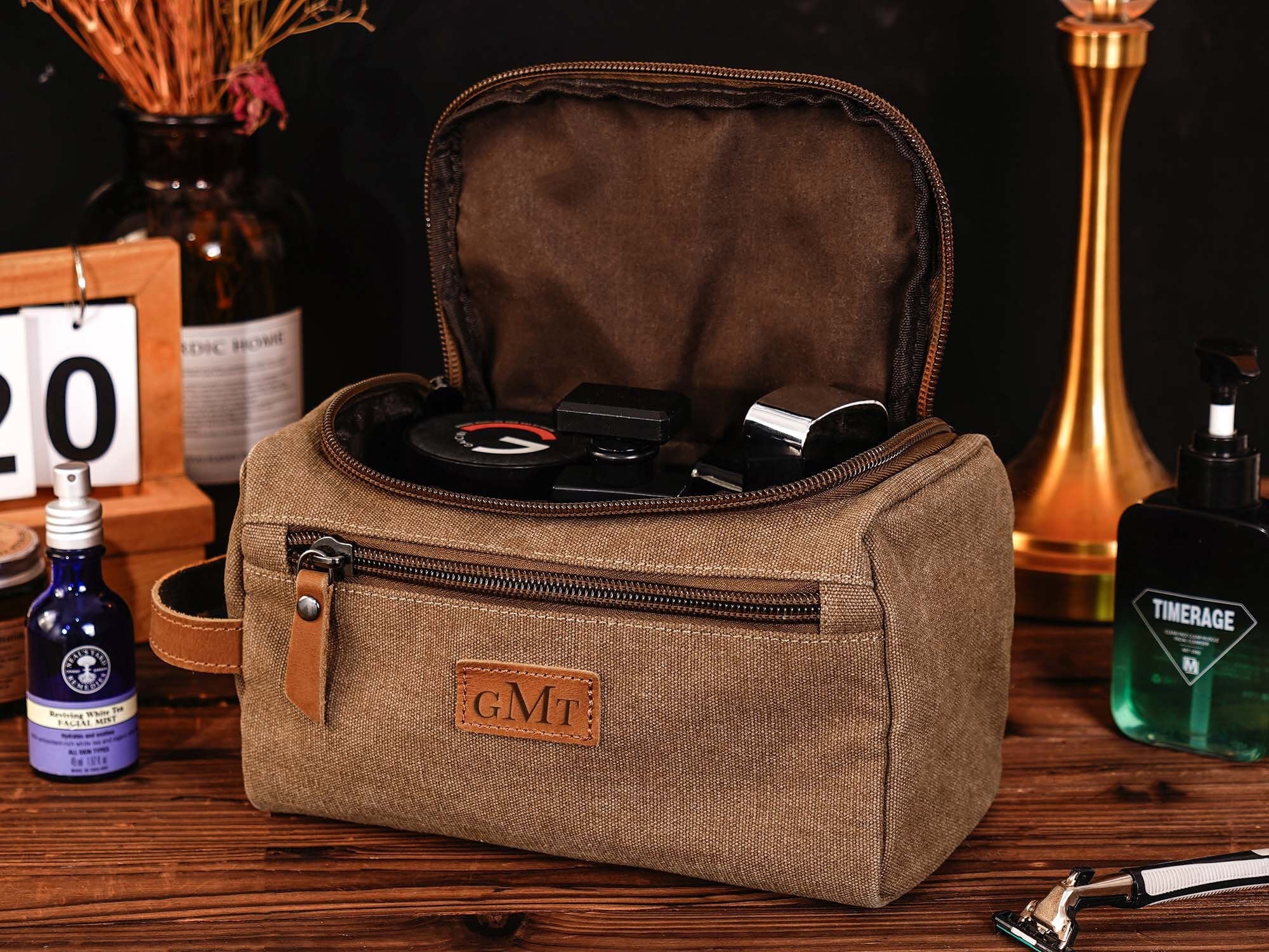 "Introducing our canvas toiletry bag for men, featuring a leather patch that can be customized ...