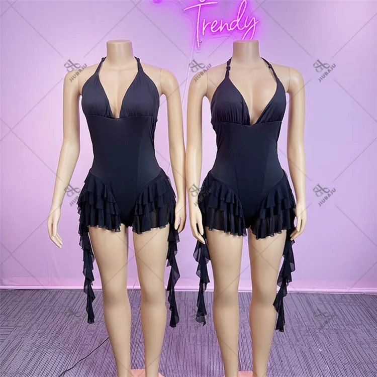 2025 Ruffles Women Summer Playsuit Black Deep V Neck Halter Backles...