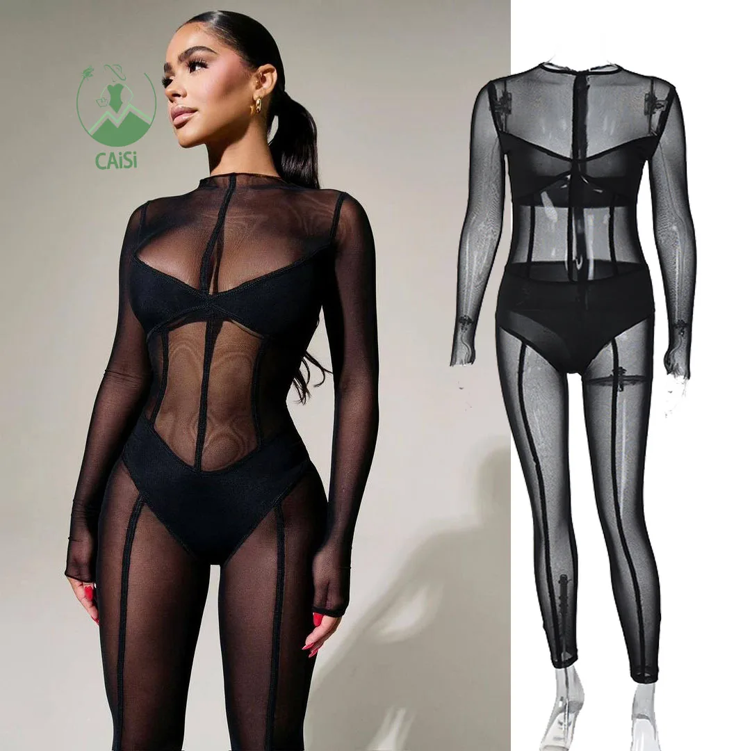 Trendy Women's Jumpsuits Black Mesh One Piece Playsuits Ladies Mesh...