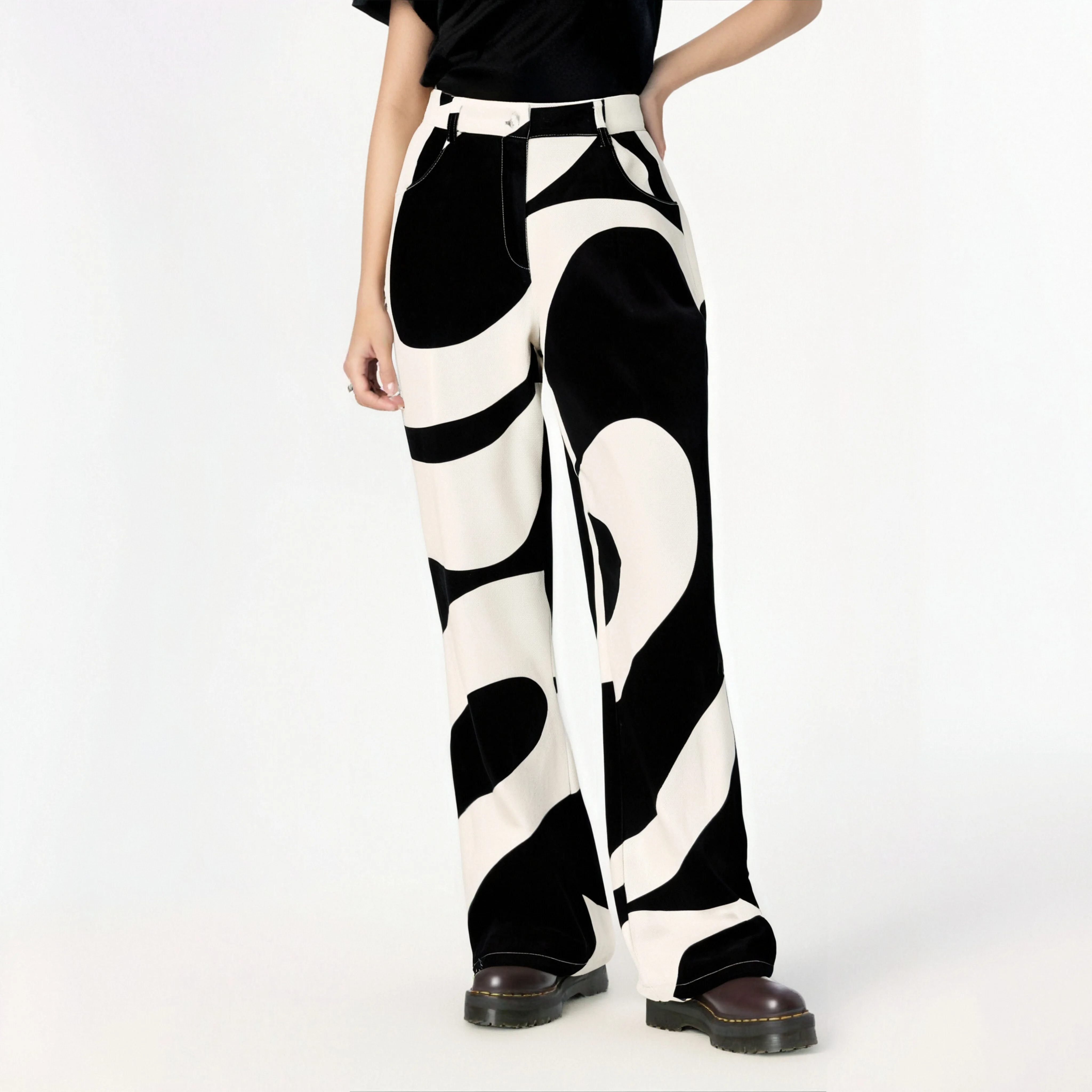 Black White Printing Women's Pants & Trousers Mid Waist Black W...