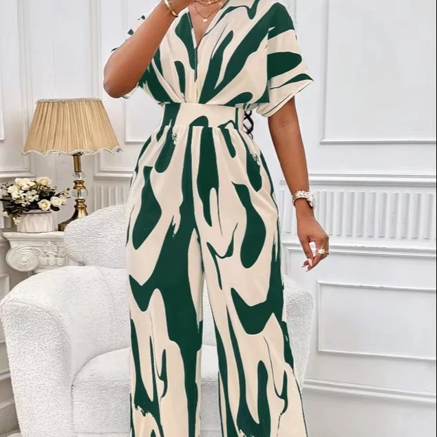Fashion Spring Summer High Waist Short Sleeve Jumpsuits Wide Leg Pa...