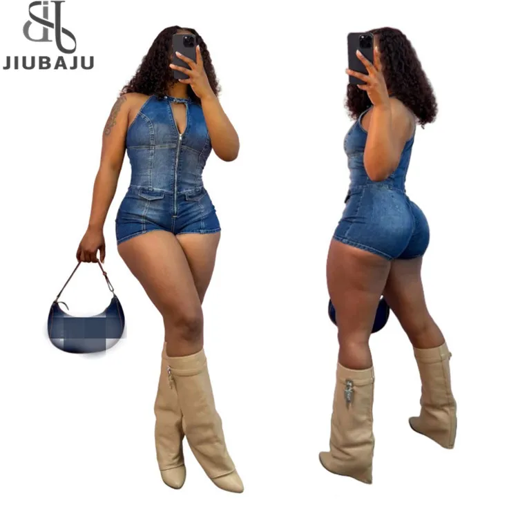 • Summer Fashion Denim Bodycon Romper Women Halter Zip up One Piece J...