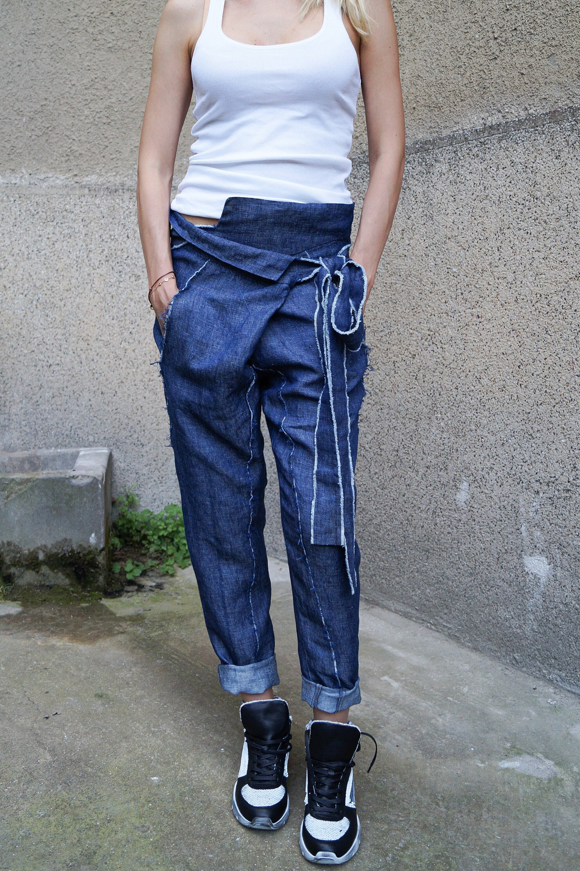 Tapered Pants/Loose Linen Pants/Denim Pants/Casual Drop Crotch Pant...