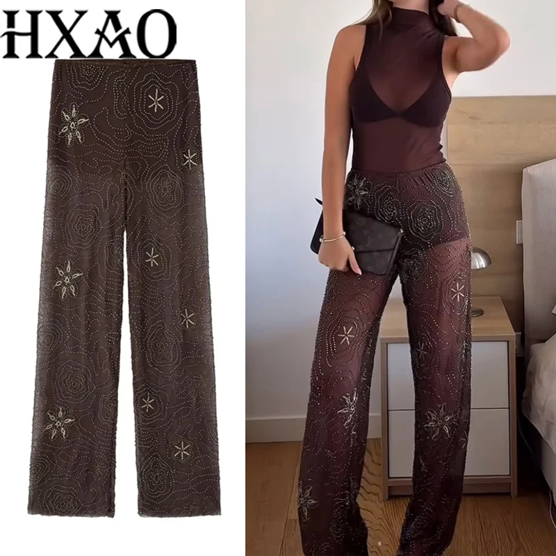 HXAO Woman Trousers Beaded Baggy Pants Women Summer Sequin New In Pants Semi Sheer Tulle Women's Tro...