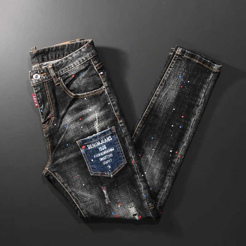 Street Fashion Men Jeans Retro Black Gray Slim Fit Ripped Jeans Men...