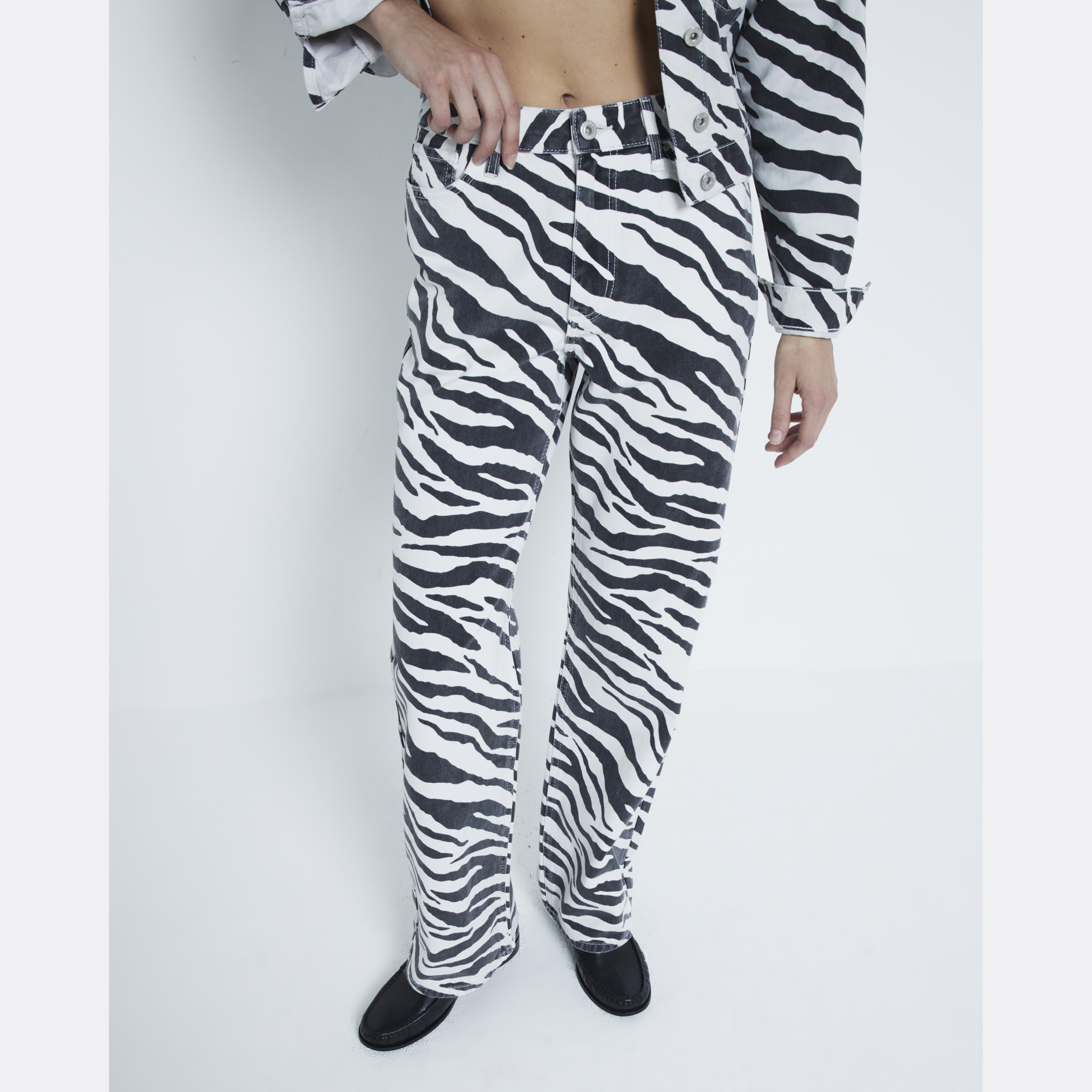 Relaxed straight fit, Denim fabric, Belt loops, Classic 5 pockets, Button and zip fastening