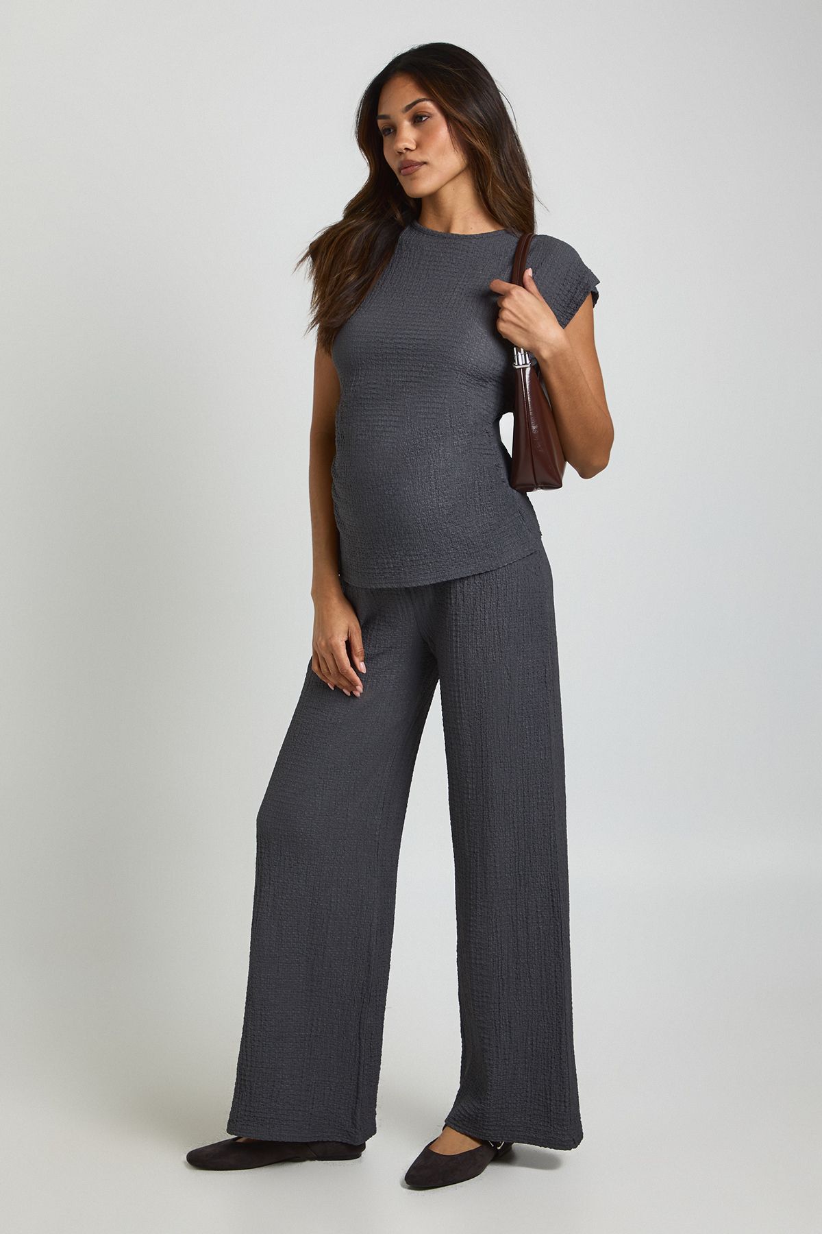 Textured fabric co-ord designed specifically for maternity wear Cap sleeve top with elegant round ne...