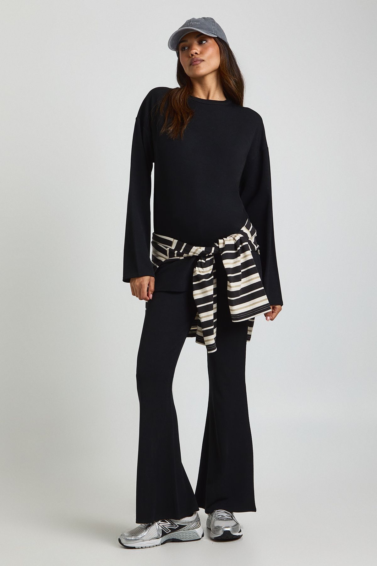 Oversized long sleeve top with split side detail for growing bump comfort Flared trousers with drama...