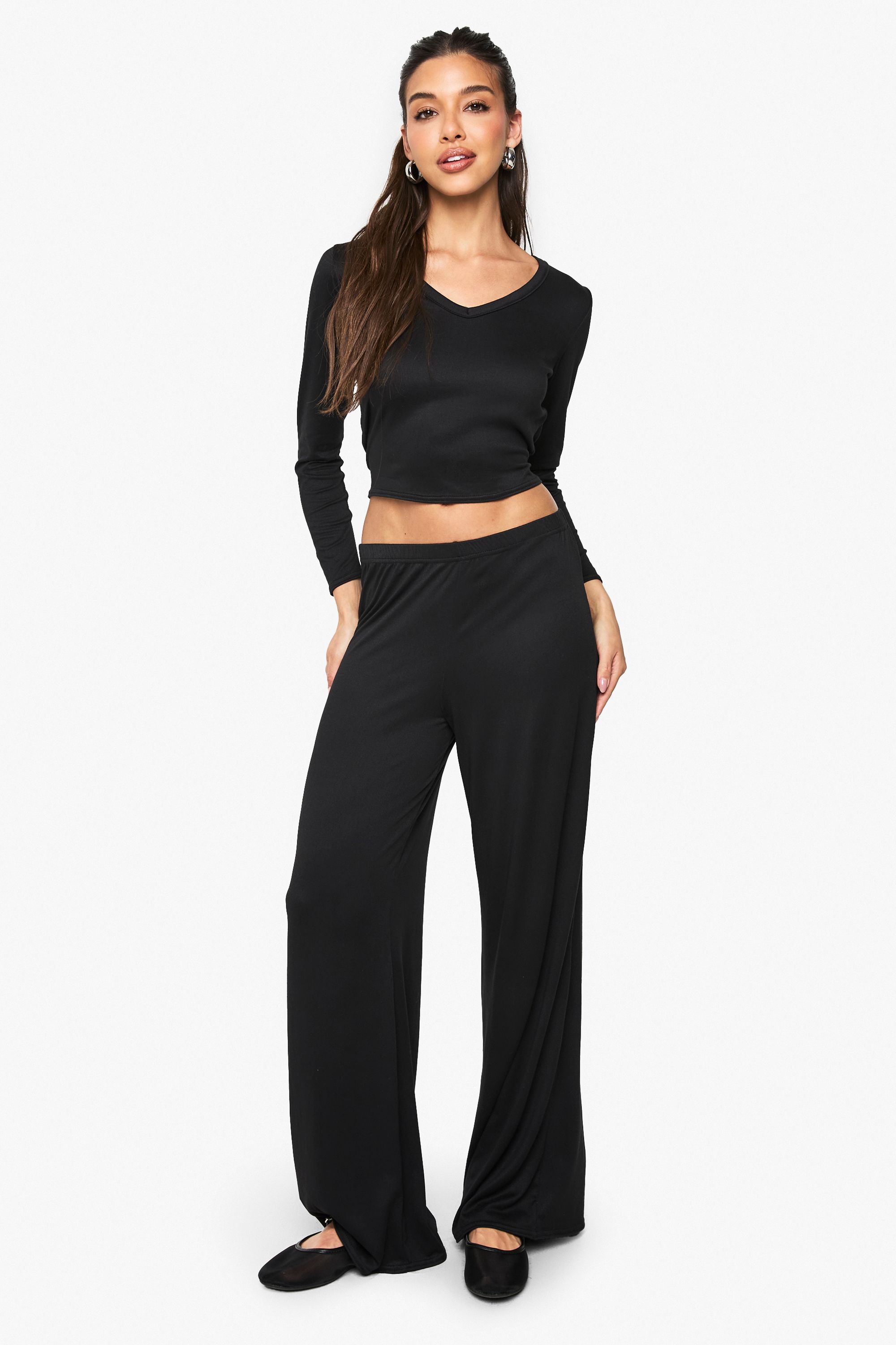 Boohoo Womens Supersoft V Neck Binding Long Sleeve Top and Wide Leg...