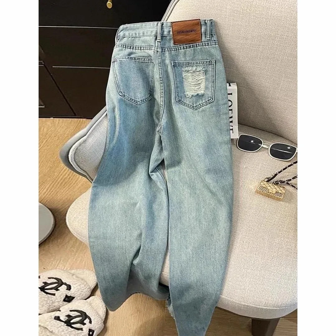Casual Jeans Womens Straight Leg Denim Trousers Loose Fit High Waist Light Blue Wide Leg Vintage Rip...