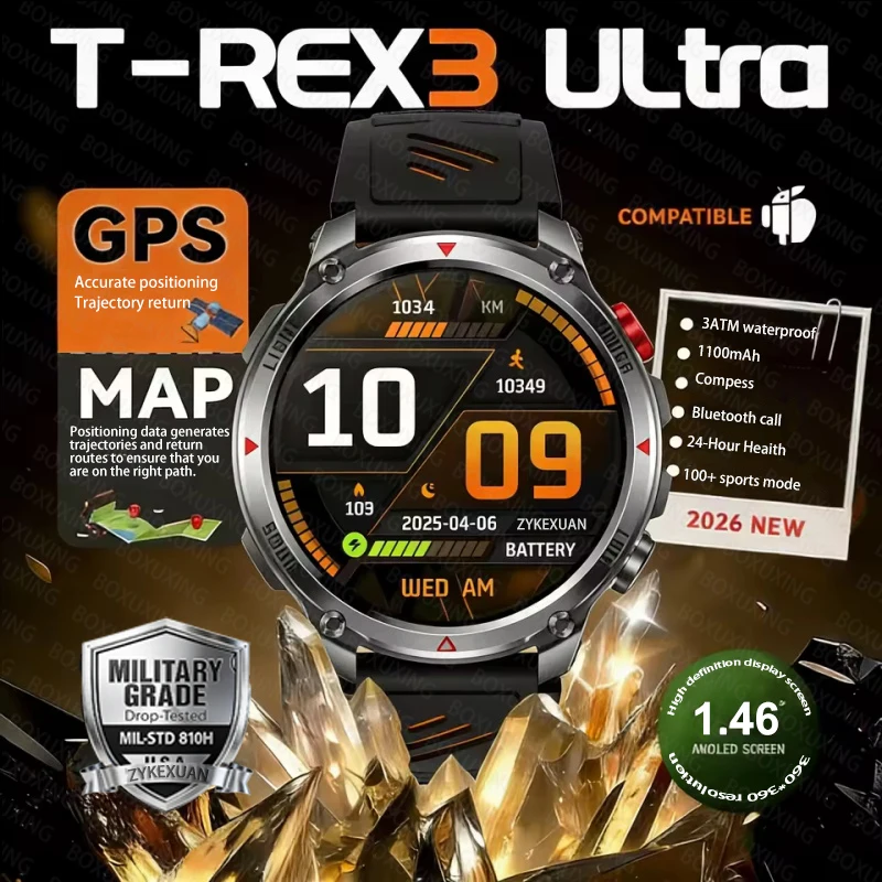 2026 New Built-in GPS Compass Altimeter Outdoor Military Smart Watch Men 1.46" AMOLED 3ATM Wate...