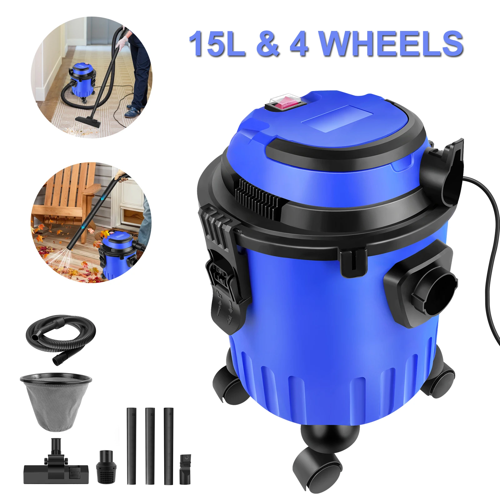 3-IN-1 Industrial Wet Dry Vacuum Cleaner Hoover, 19kpa Powerful Suction Bagless, 15L Capacity, 4 Cas...