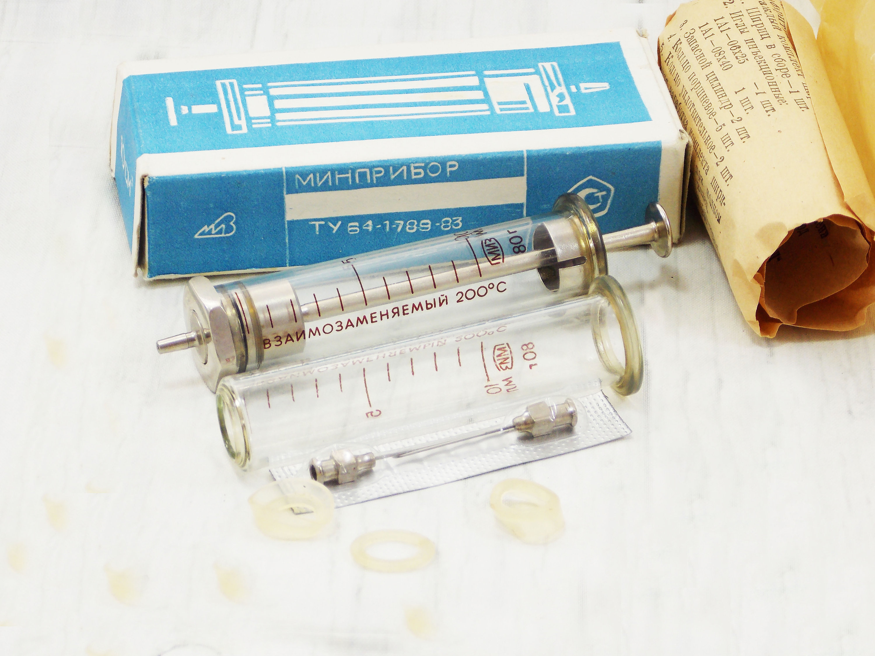 This vintage syringe was made in the 1980s in the Soviet Union. This 10 ml of glass and metal syring...