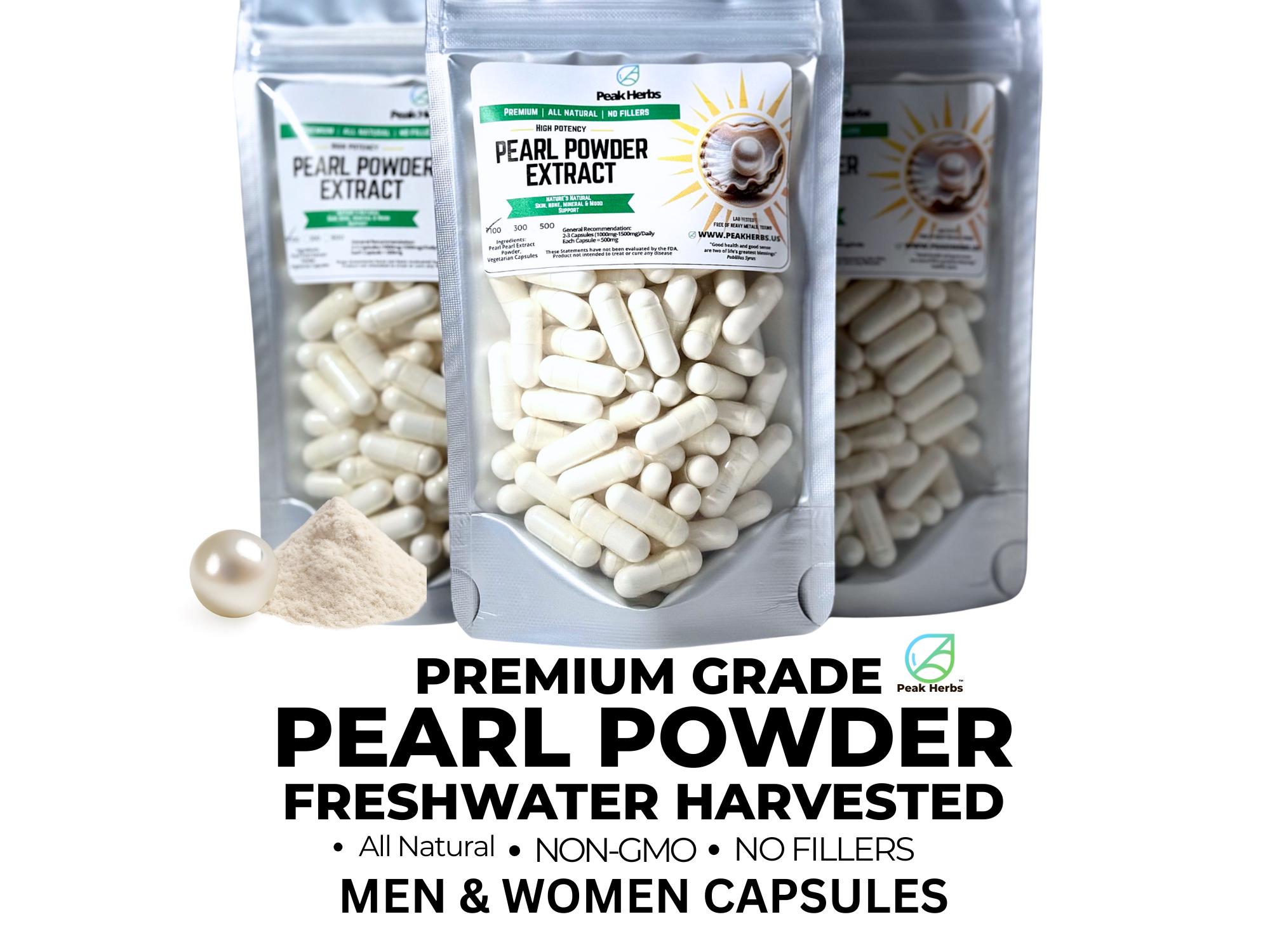 Premium Freshwater Pearl Powder Extract Capsules by Peak Herbs. -Serving Size: 3 Capsules (1500MG) -...