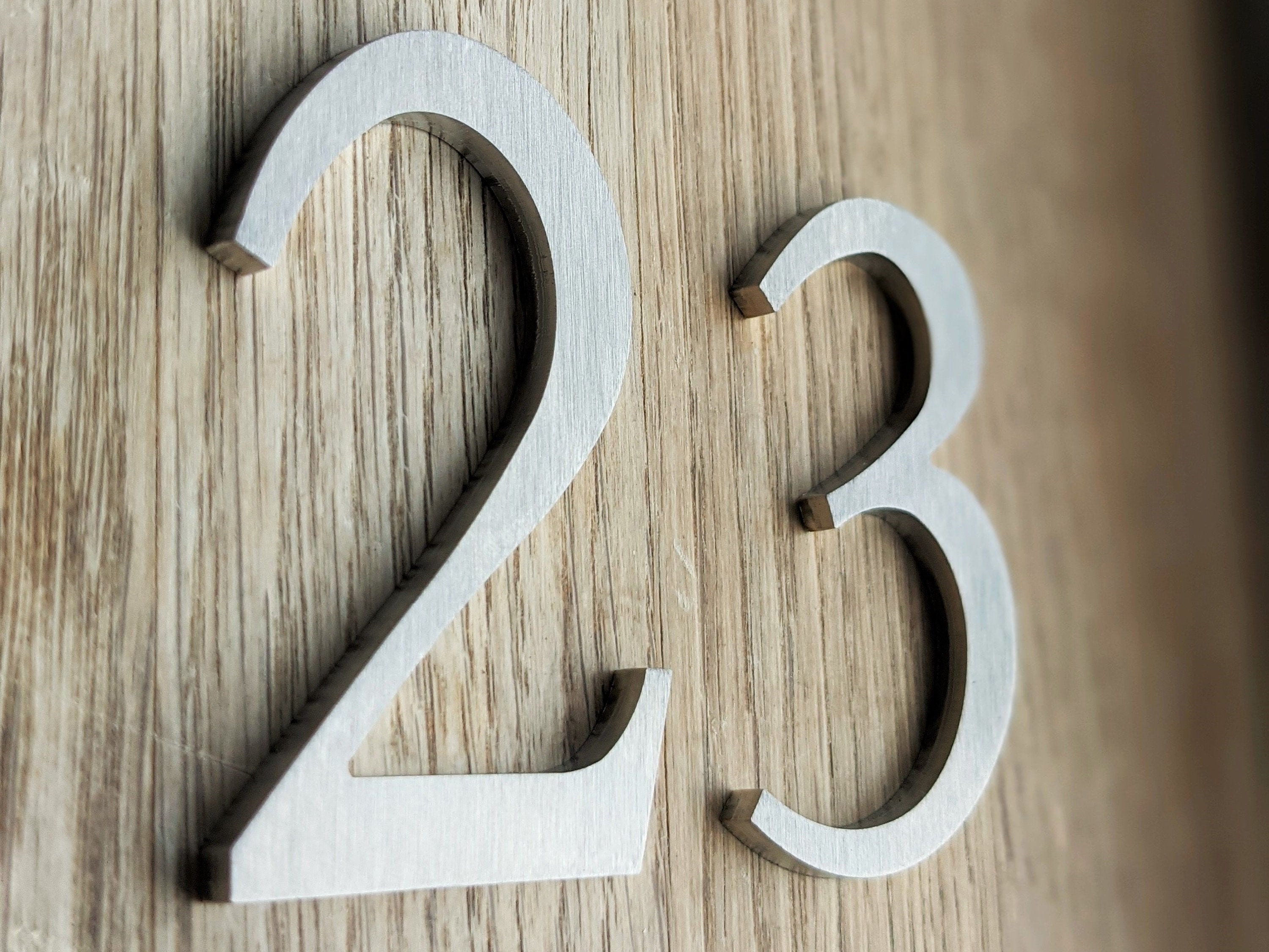 Traditional stainless steel door numbers at 55mm high in Plantin font with a hidden fixing for woode...