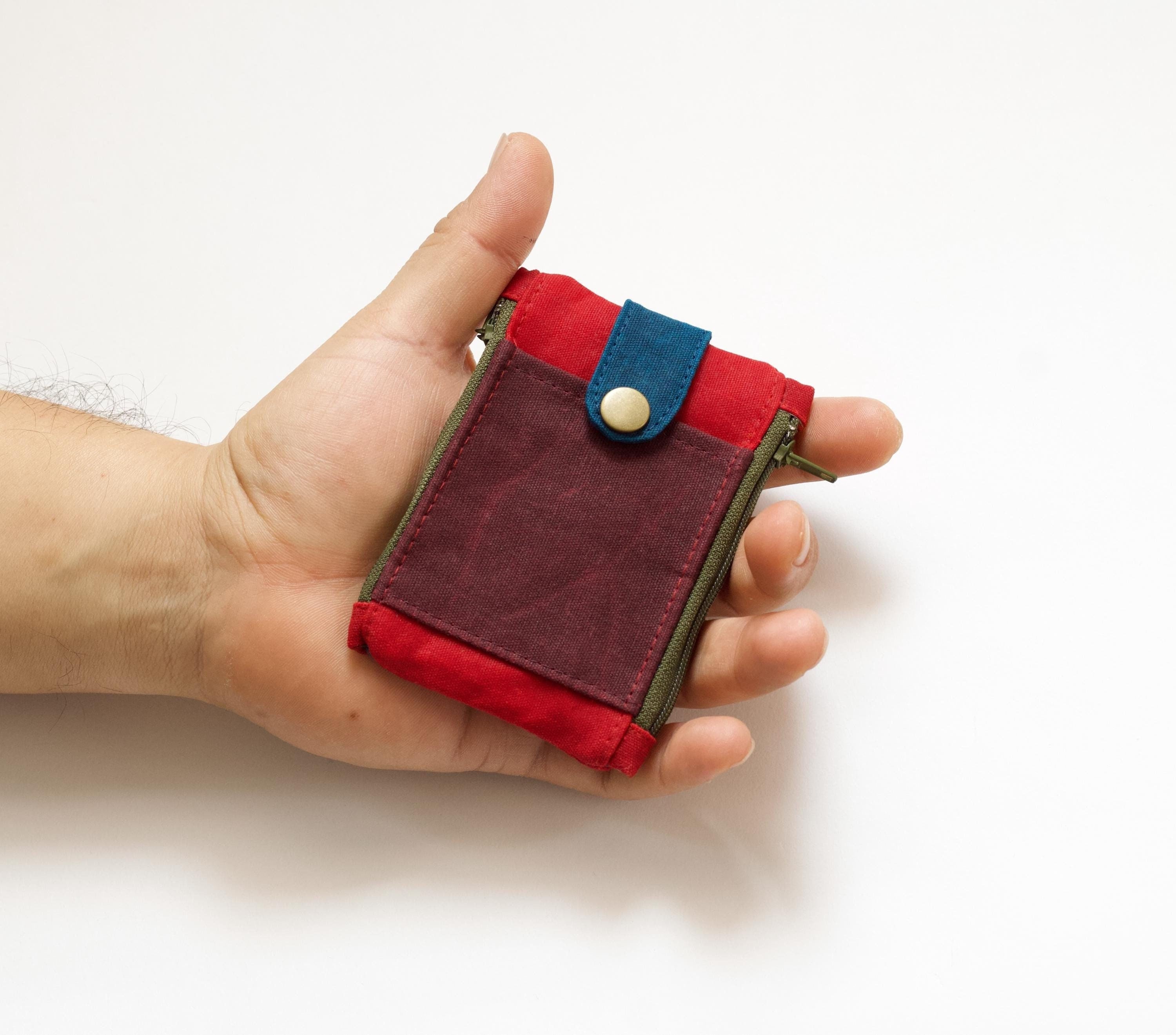 This is a mini pouch wallet made with waxed canvas, the colors are burgundy and red dahlia. the stra...