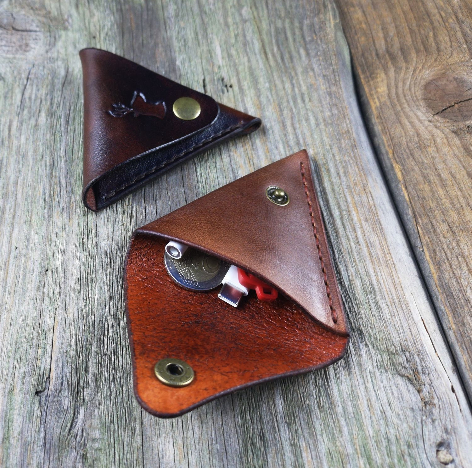 A high quality triangular coin purse (with snap closure) handcrafted form vegetable tanned cowhide l...