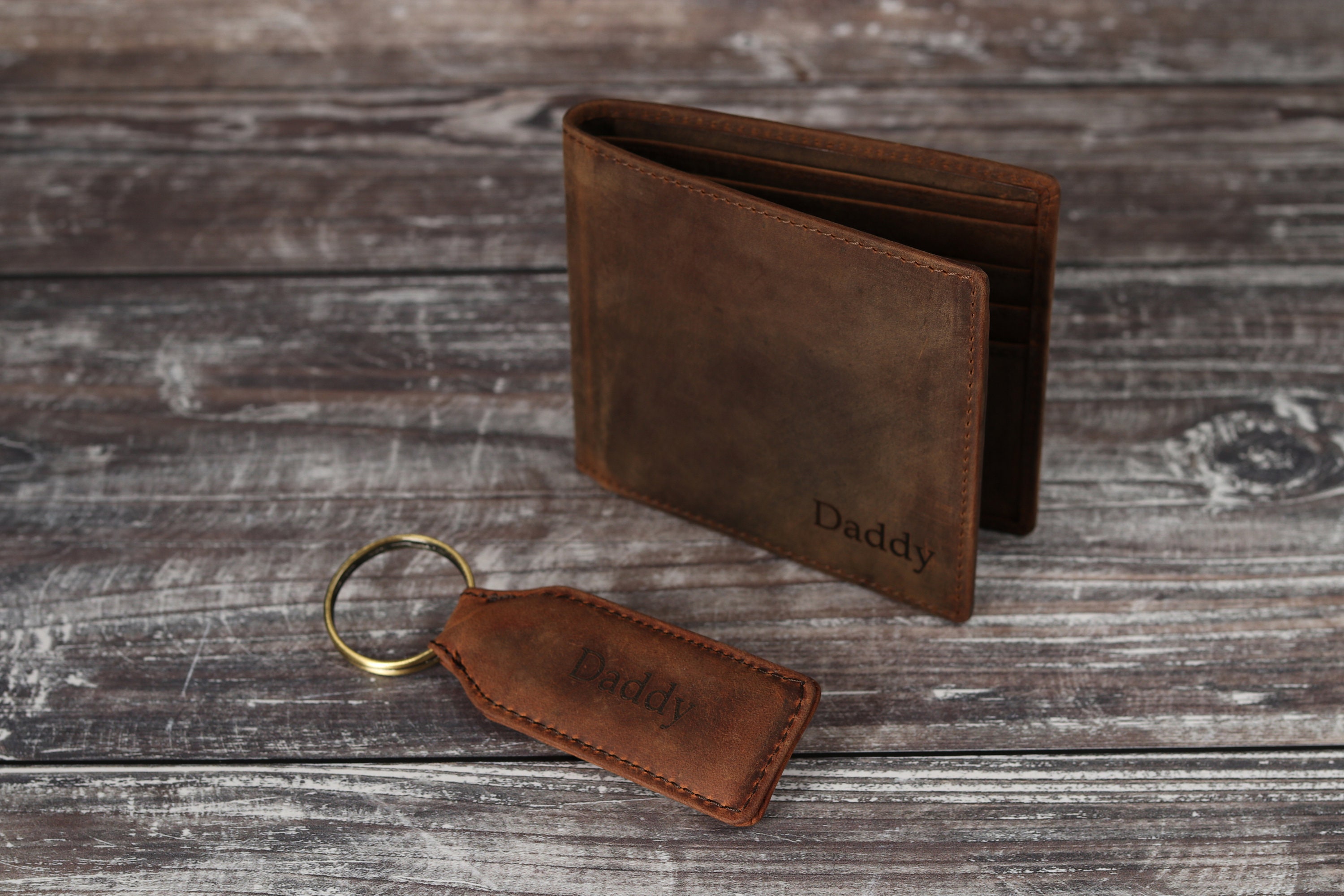 Vintage look genuine leather wallet with keyring which can be personalized engraved inside and outsi...