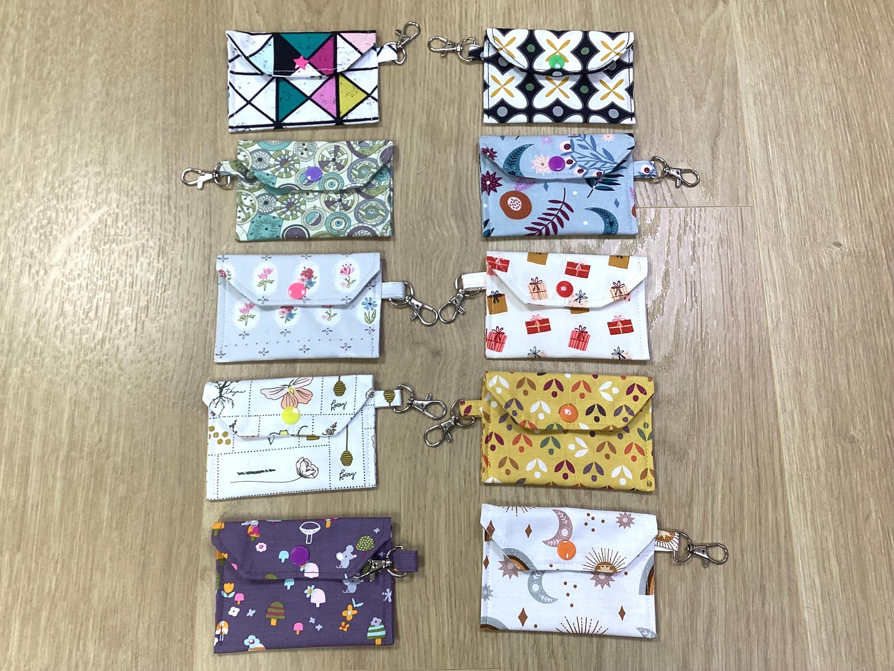Hand made mini fabric wallet or card holder, with key chain and Popper fastener on the flap. The wal...