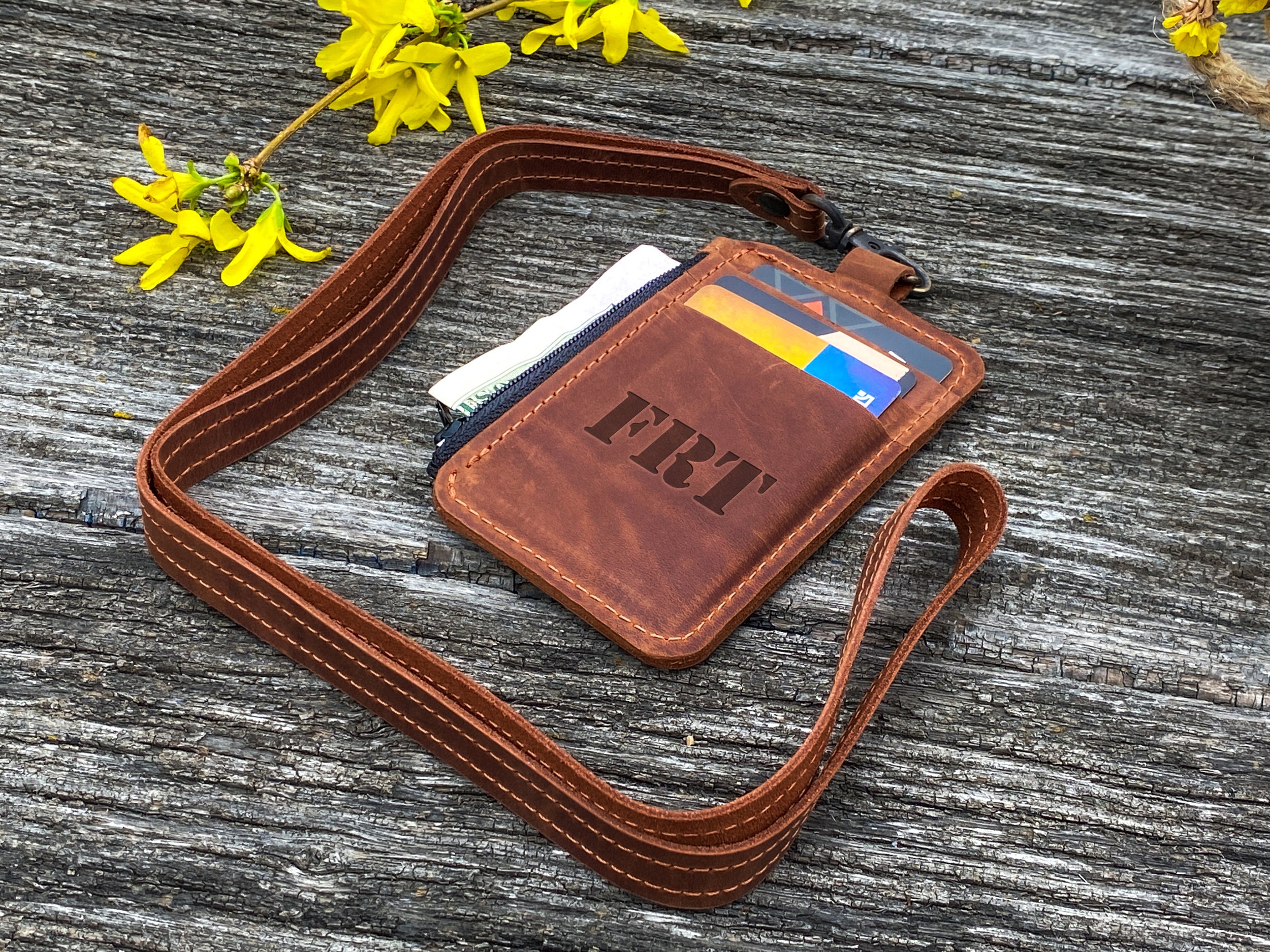 Personalized Leather Card Holder, Leather Lanyard Card Holder, Leat...