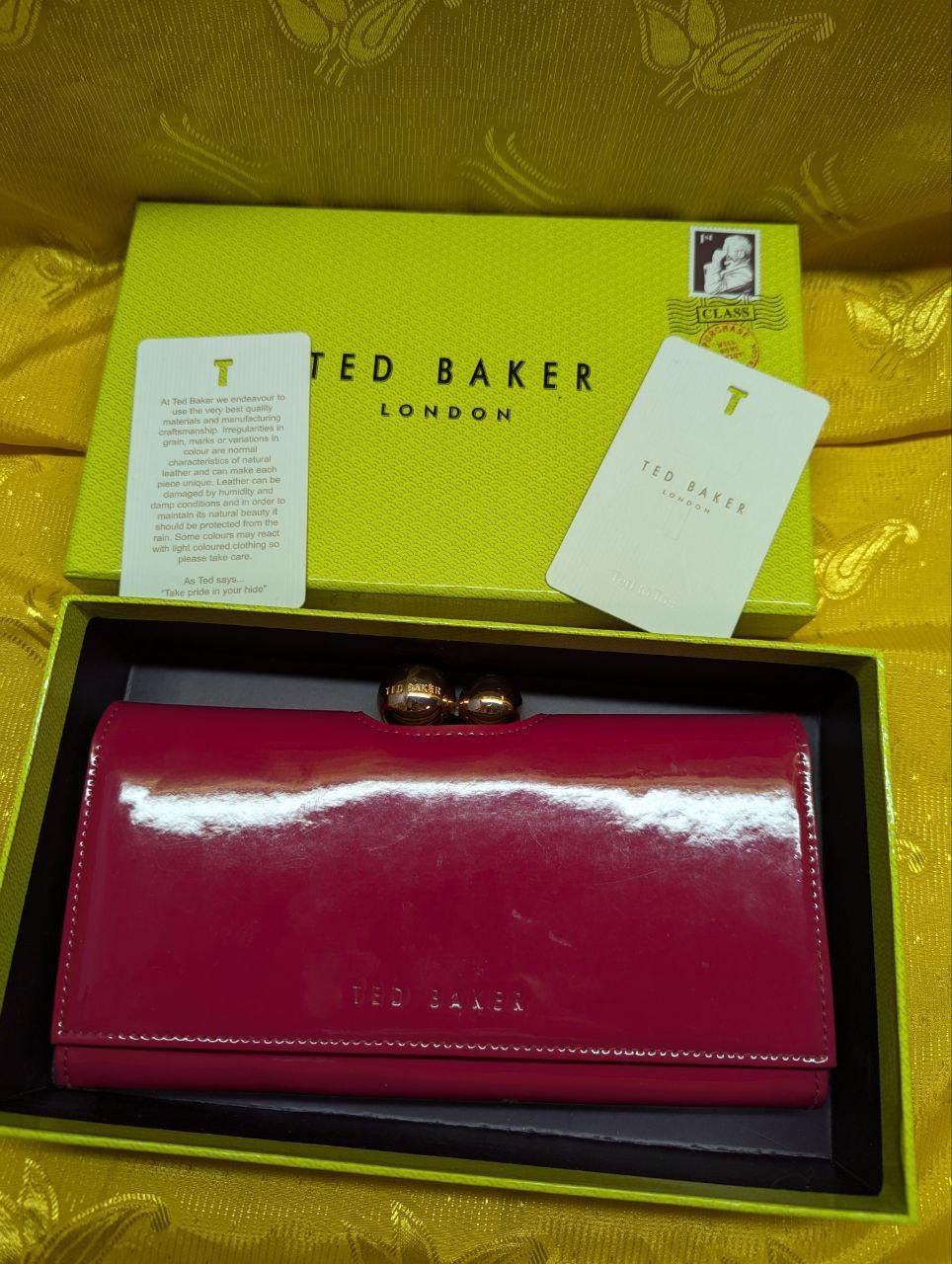 Elevate your style with this Authentic Ted Baker Pink Popper Patent Leather Clutch-Wallet. Perfect f...