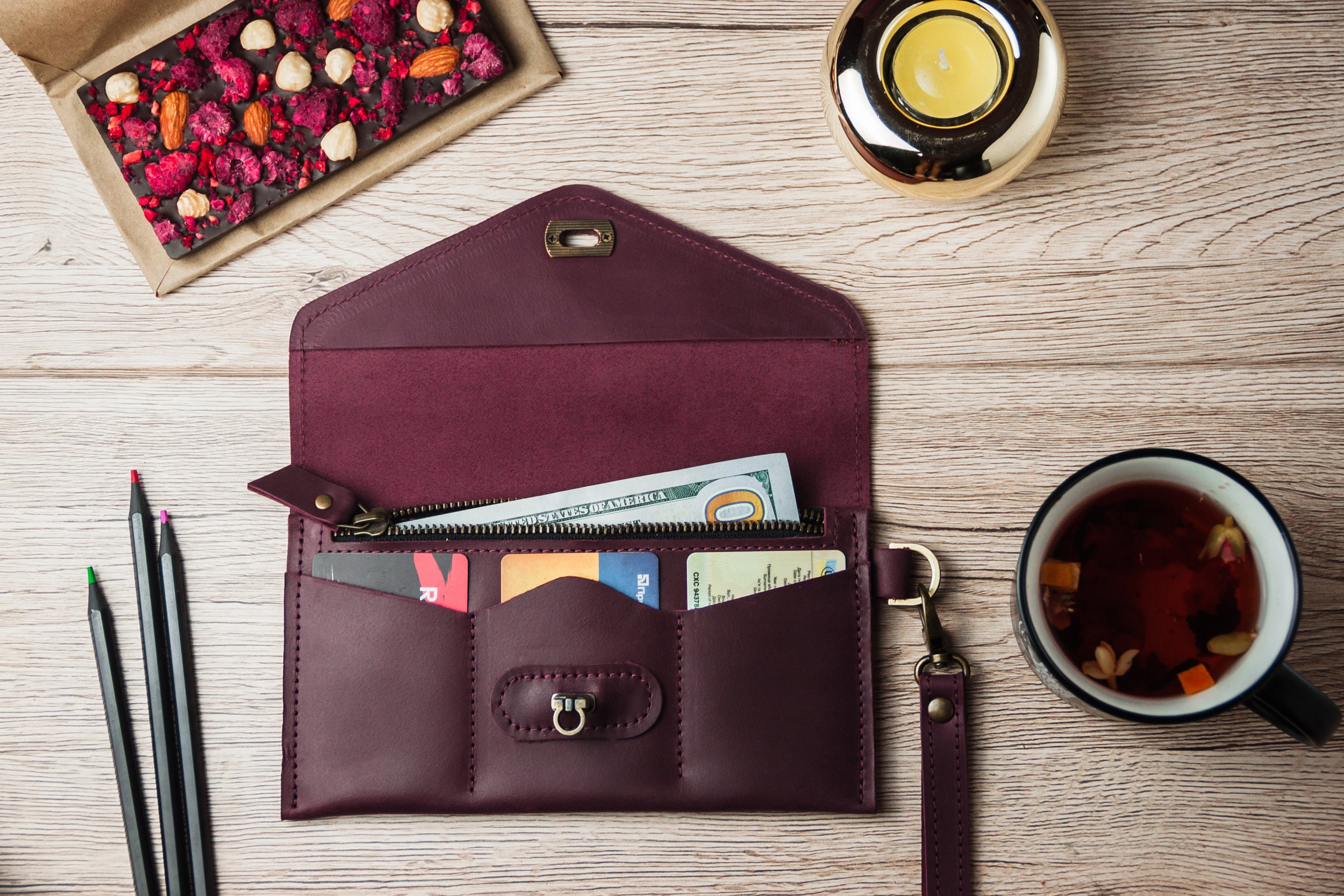 Handmade leather wristlet wallet, Monogrammed wristlet wallet, Pers...