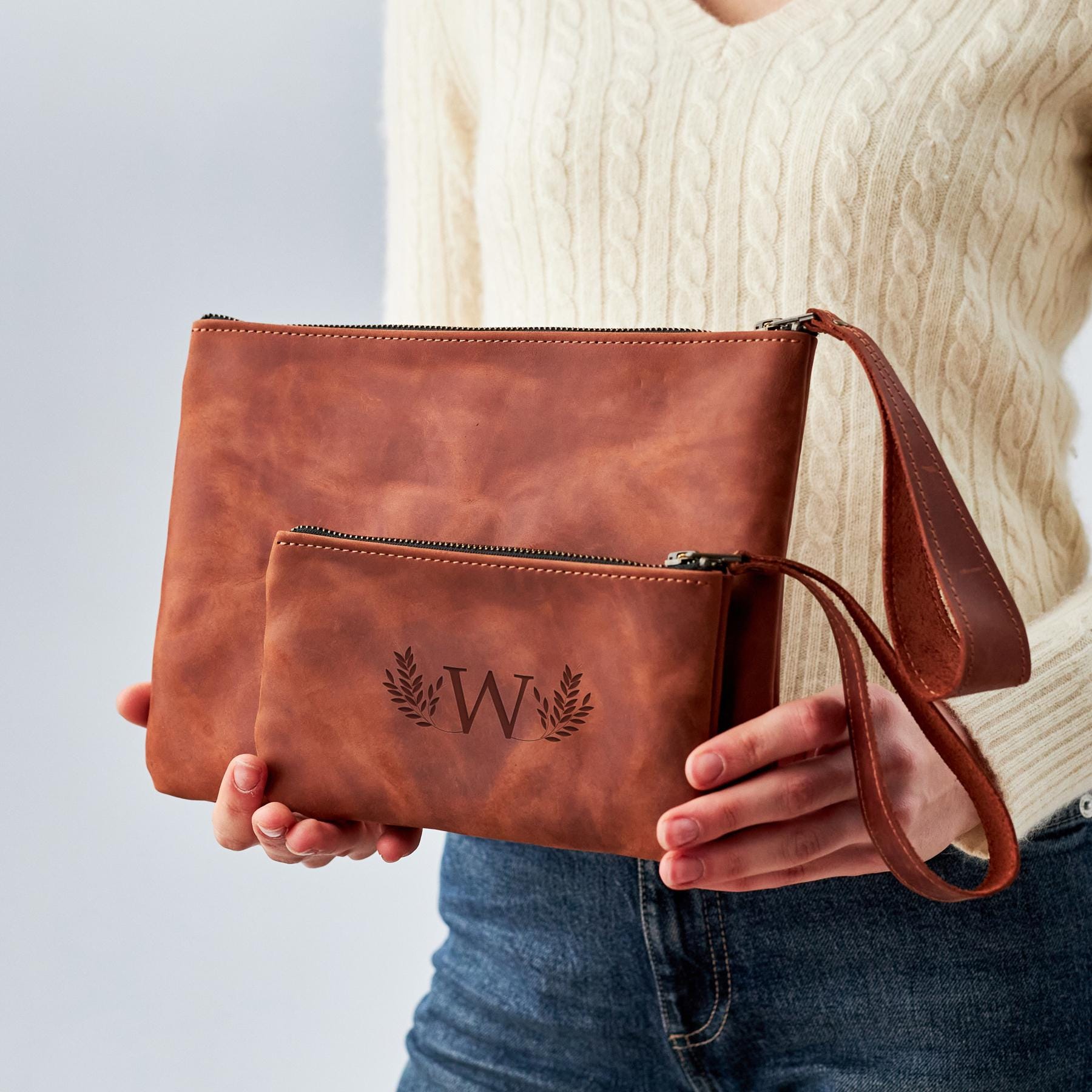 Leather wristlet zipper pouch, Personalized zipper pouch, Flat zipp...