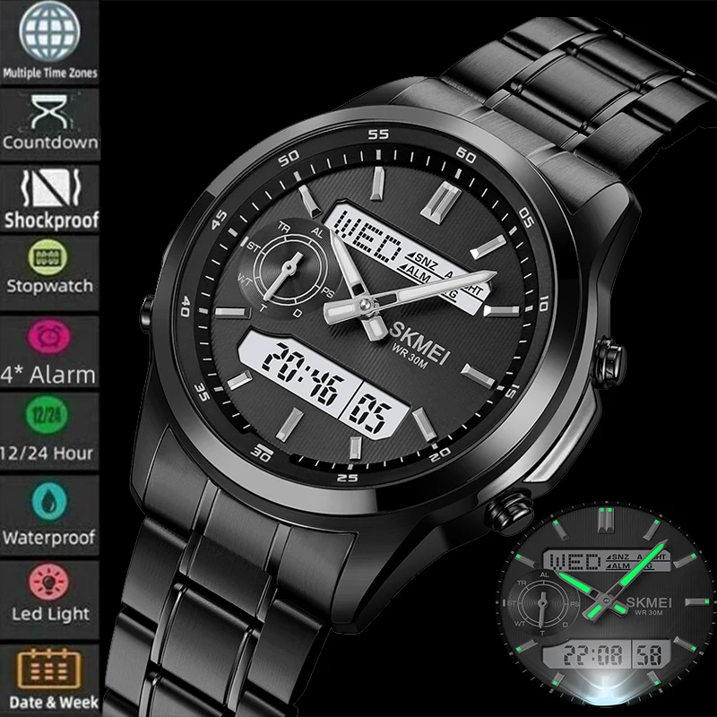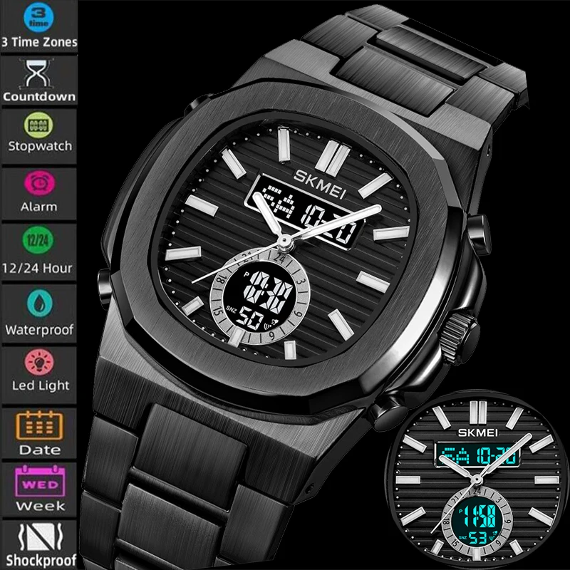 Skmei Analog Digital Display Mens Bracelet Watches Three Time Zone LED Waterproof Quartz Sports Chro...