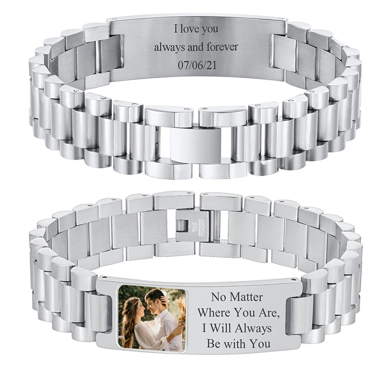 Custom Picture Text Bracelet Watch Band Stainless Steel Link Bracelet Custom Engraving Photo/Text/Na...