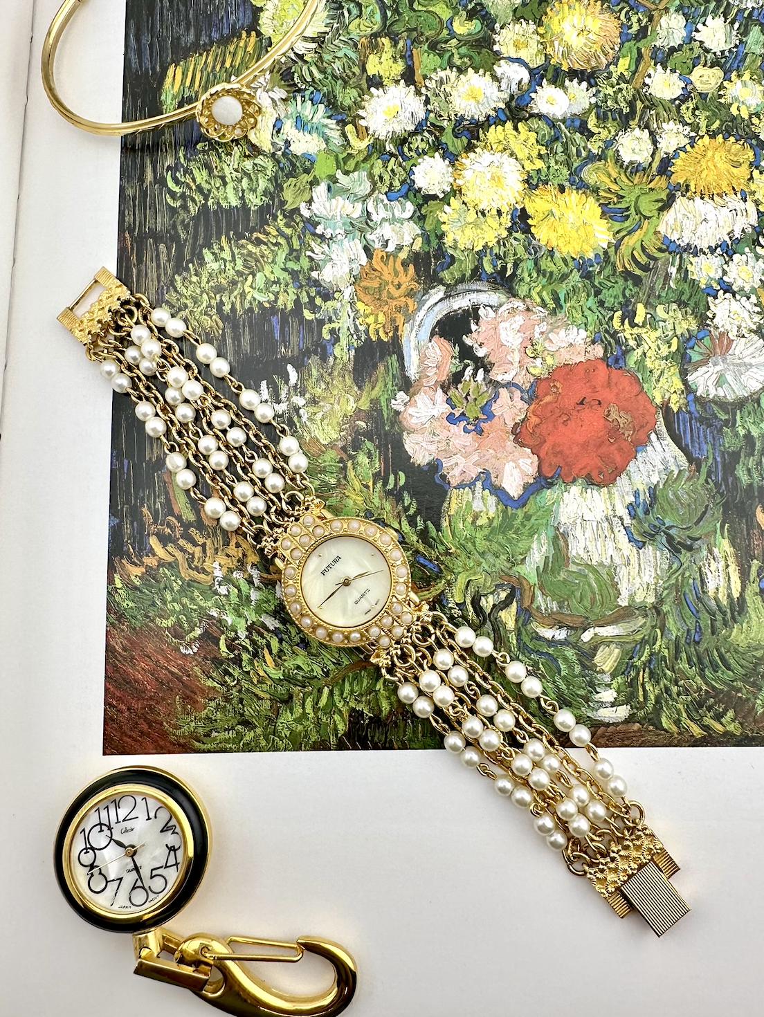 "Vintage Women's Watch with Faux Pearl Multi-Strand Bracelet, ...