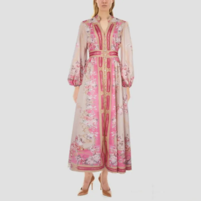 Vacation Vibes Floral Print Long Sleeve Single Button Dress Women's Retro Style Maxi Dress Casual A-...