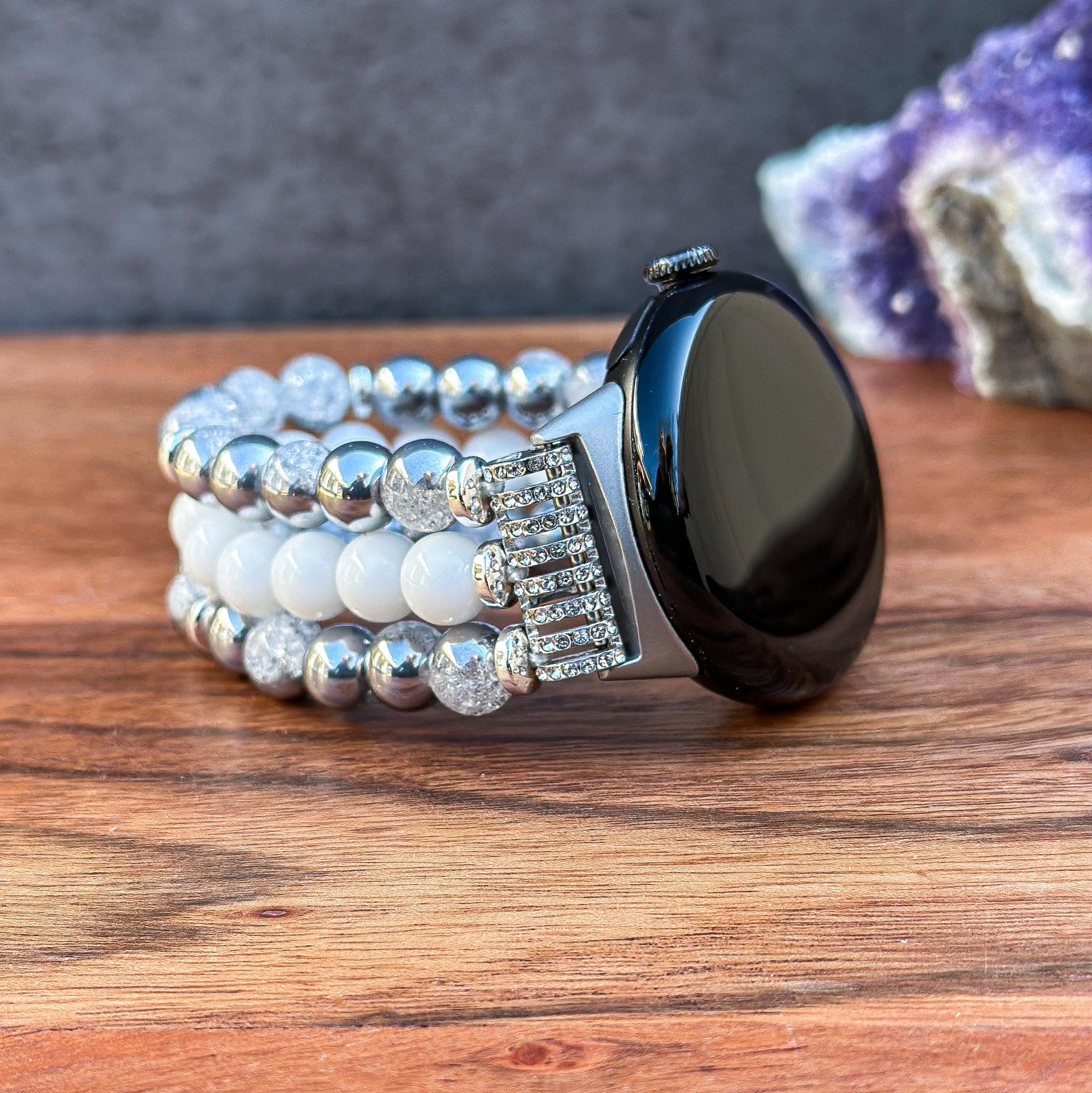 Beaded Band for Pixel Watch with Silver Snow Cracked Crystal and Wh...