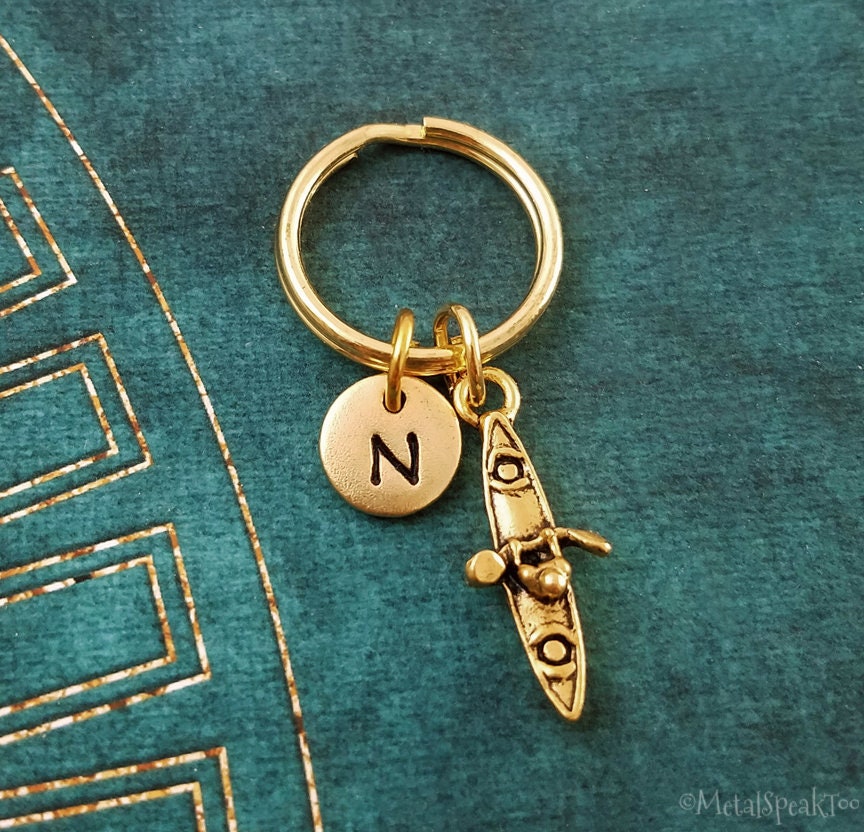"This listing is for a personalized kayak pendant keychain with a hand-stamped initial charm. W...