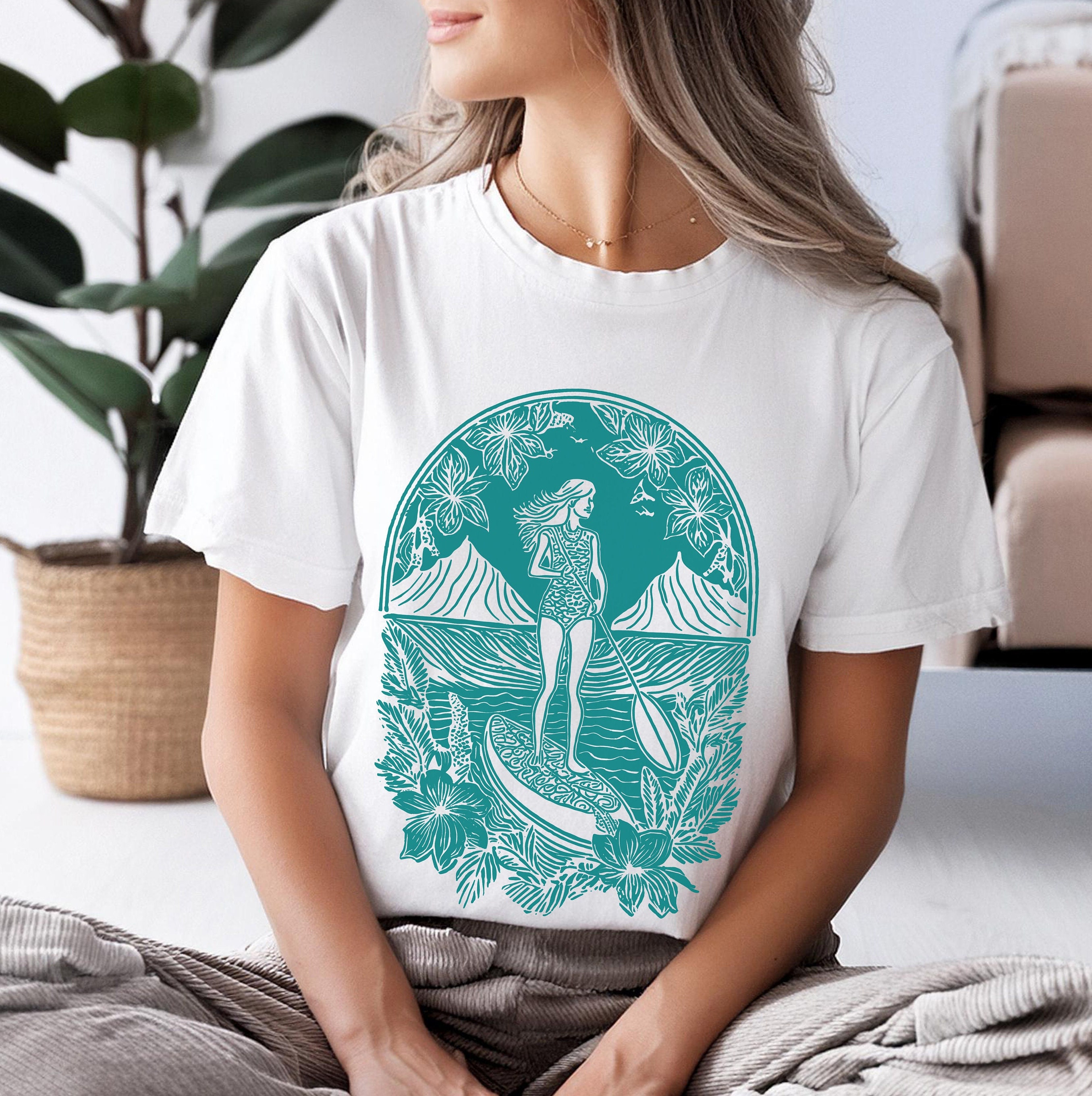 Female Paddle boarding shirt in a beautify linocut block print style, Stand Up paddle Boarding shirt...