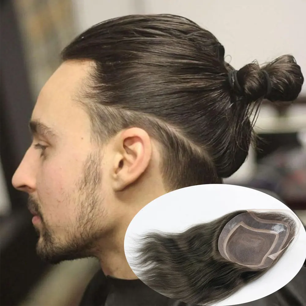 Toupee for Men 12'' Long Human Hair Mens Toupee Mono Base with PU A...