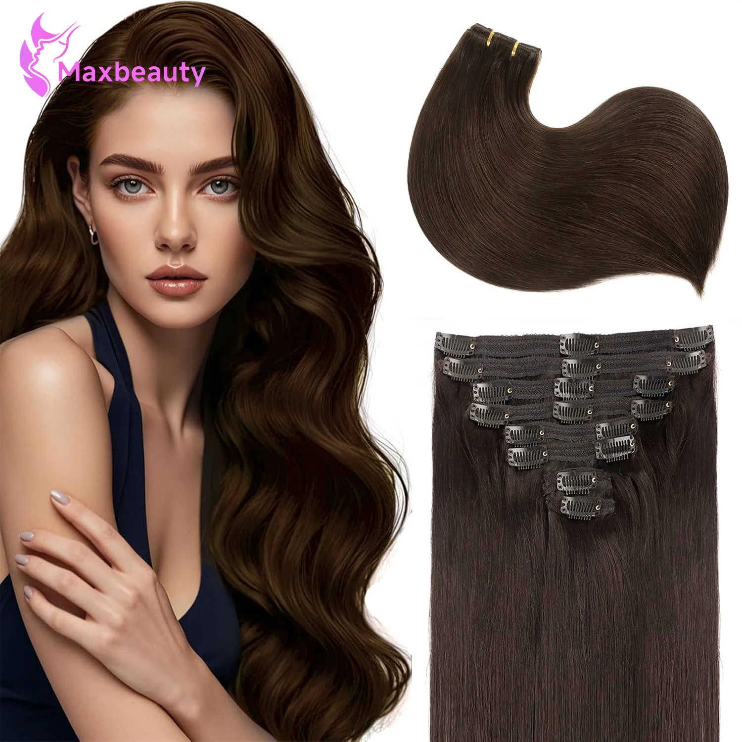 Clip In Hair Extensions Straight Human Hair Dark Brown Clip In Exte...