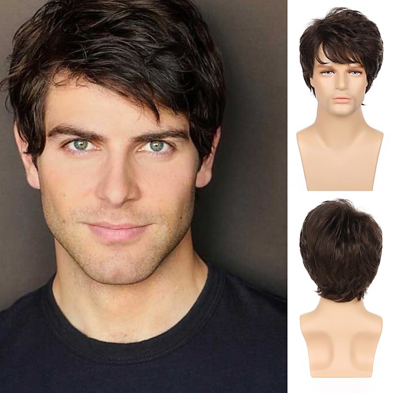 Mens Short Brown Wig Short Layered Wig Natural Fluffy Synthetic Cos...