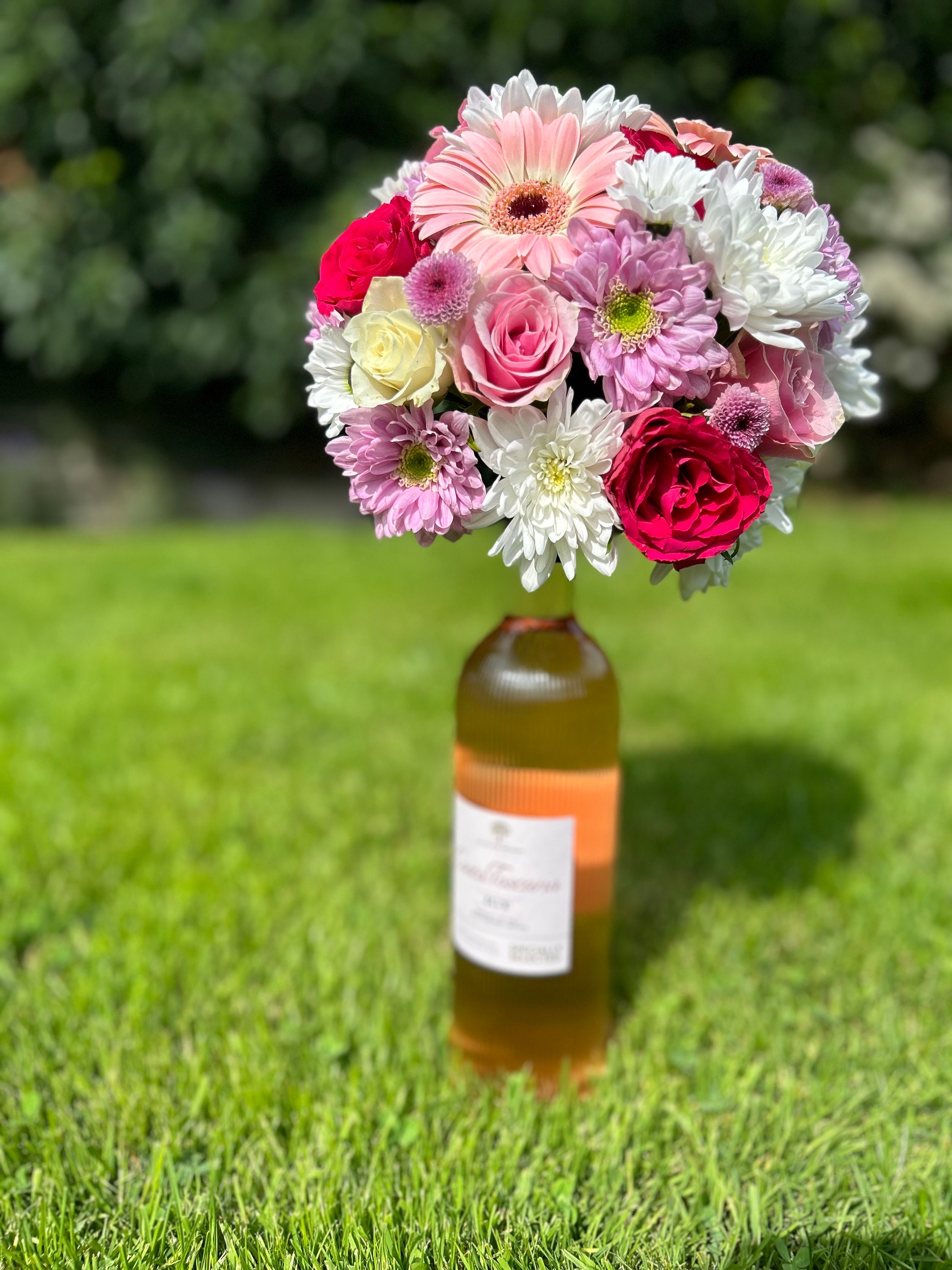 A Beautiful Real Flower Bouquet on Top of Wine, Birthday Present, M...