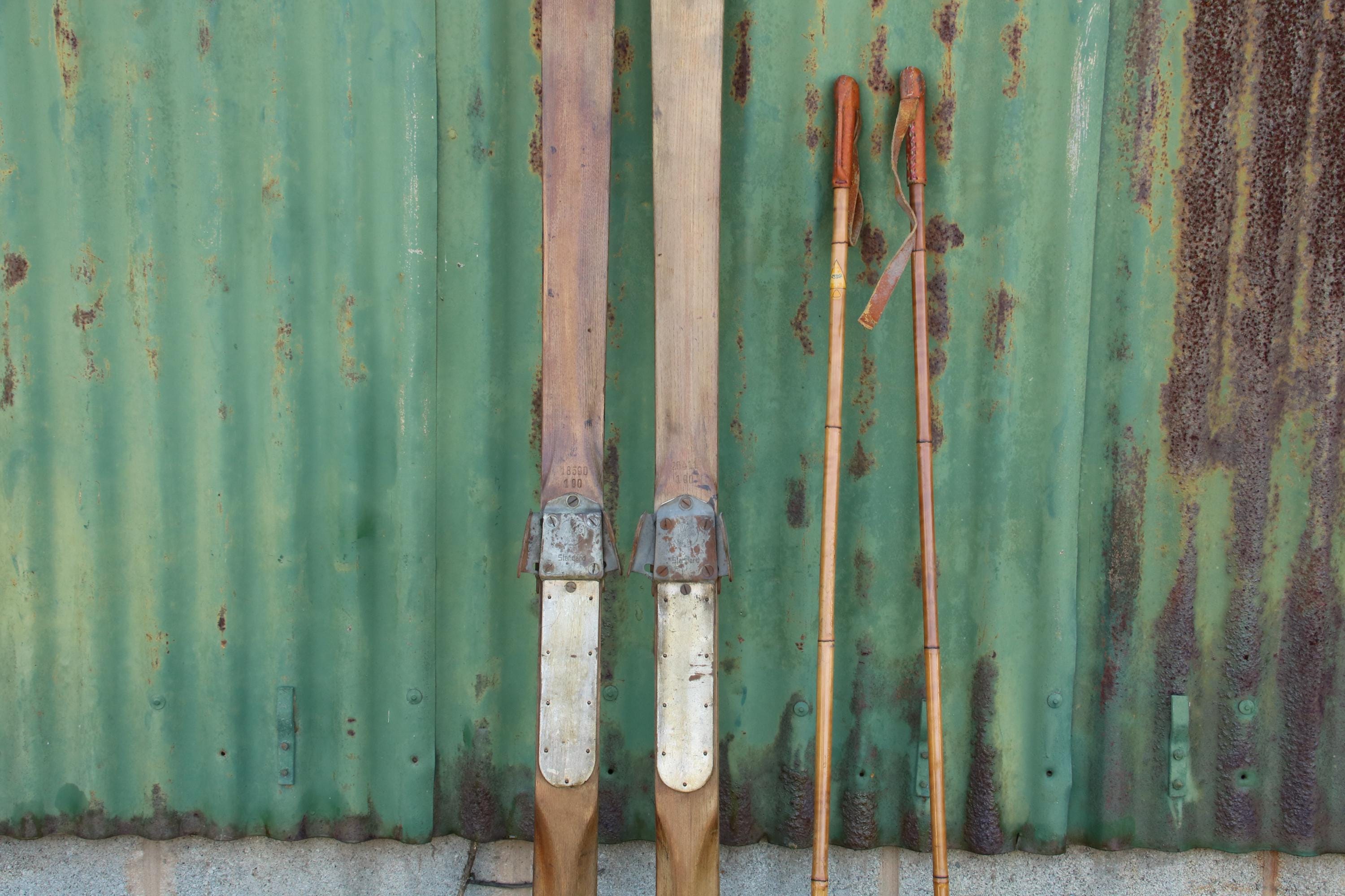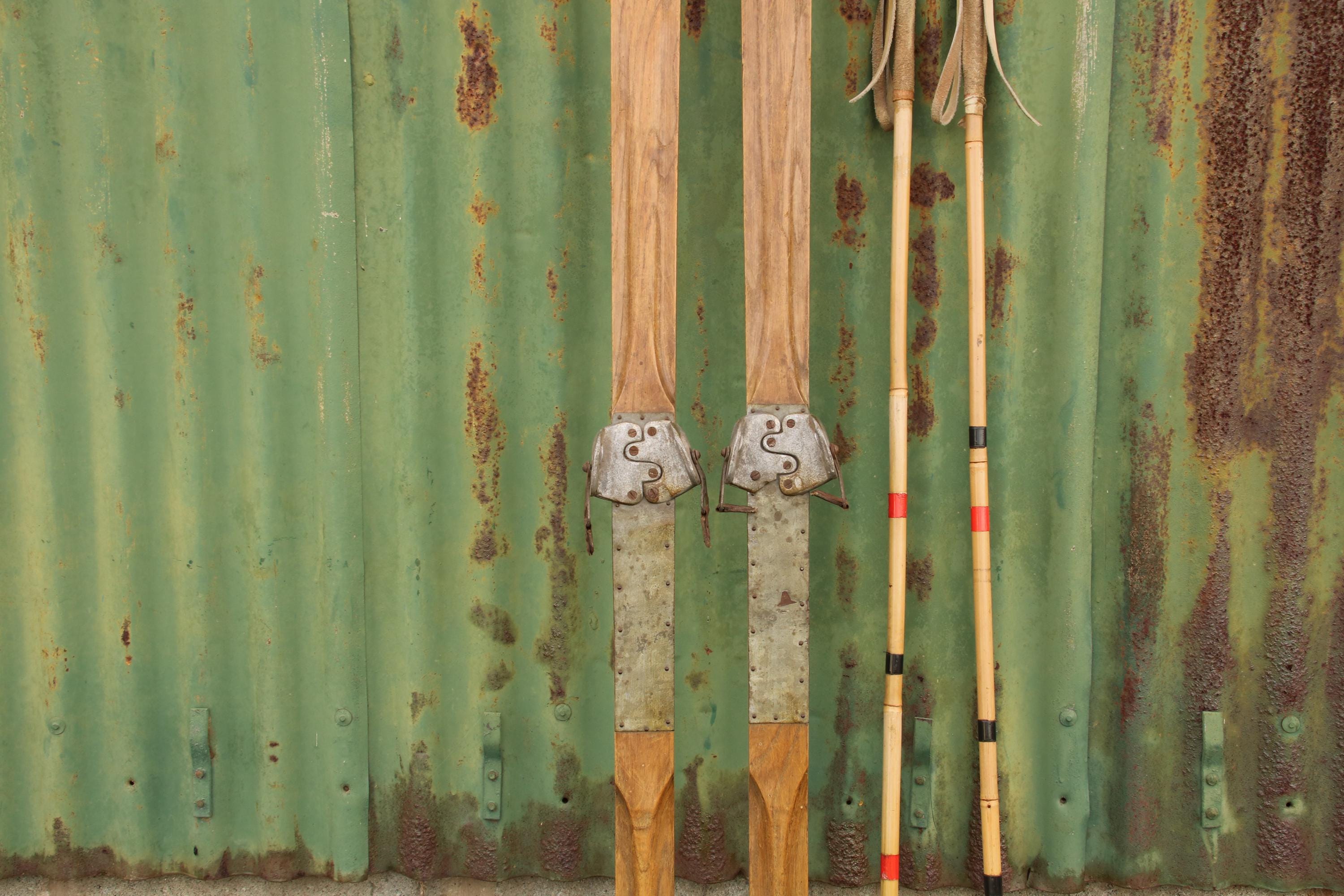 A set of antique wooden skis complete with poles. Perfect for decorative purposes, at home or in a s...